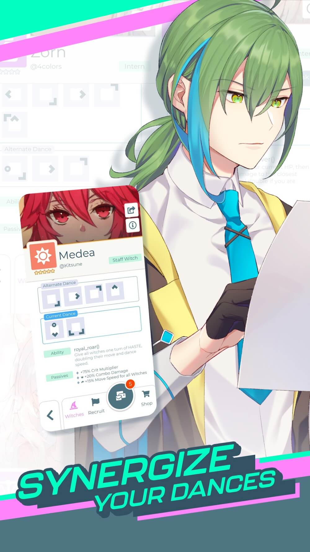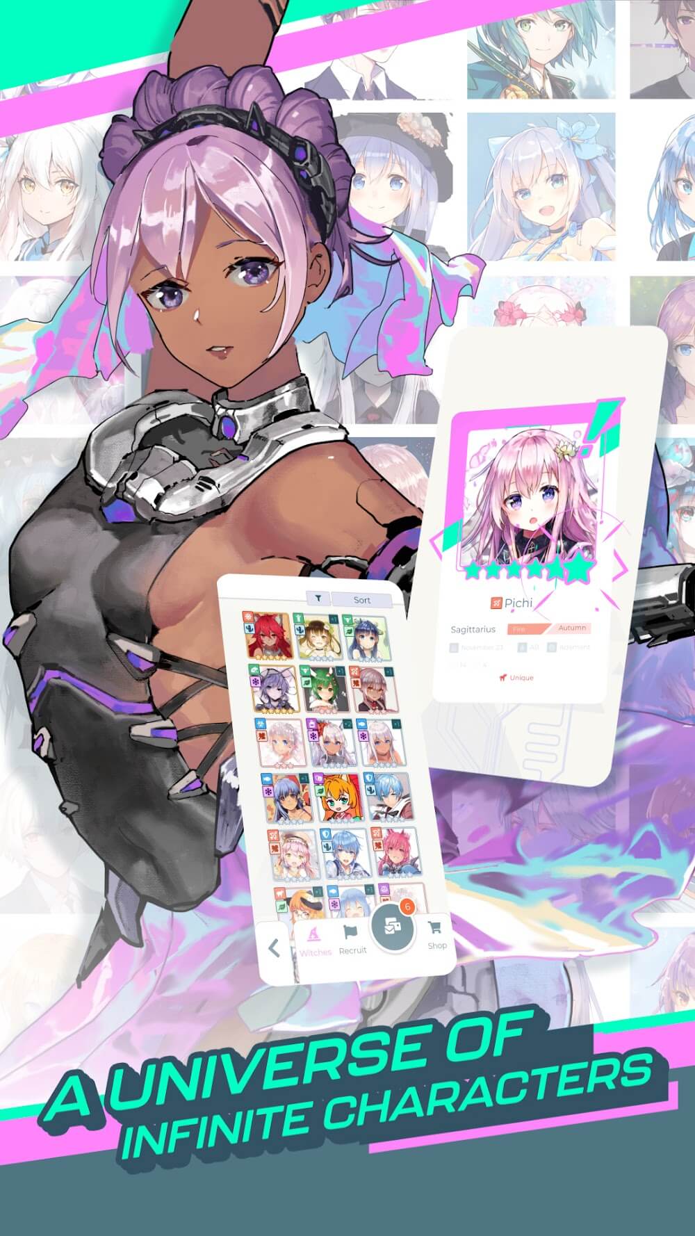 Hay cientos de brujas diferentes, cada una con su personalidad, baile, poderes y pasivas. Te encontrarás con cada una de ellas durante tus aventuras. Las habilidades de un personaje se pueden combinar con las de otro para formar una nueva, lo que te permite formar equipos con efectos sinérgicos. Debes armar el mejor equipo posible para terminar el trabajo con éxito. Puedes añadir una de las brujas raras a tu colección si tienes suerte en el gacha.