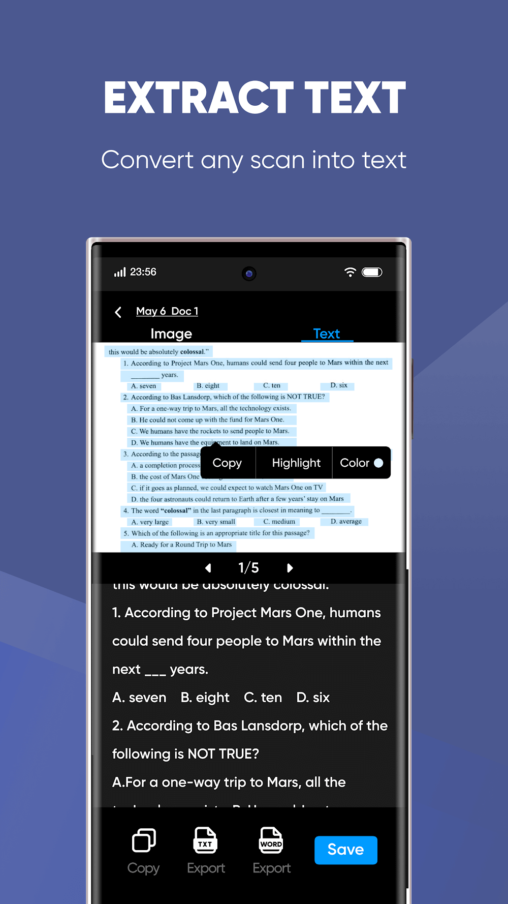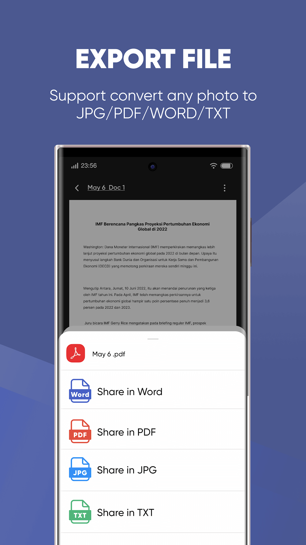 Camera Scanner – PDF Scanner es un editor esencial para aquellos que a menudo tienen que lidiar con documentos de oficina. Nuestro escáner móvil facilita la entrega de información con la velocidad de procesamiento de información más rápida. Cada documento es compatible en cada formato, por lo que no tienes que hacer demasiadas conversiones de aplicación. Además, muchos procesadores de imágenes te ayudan a alinear bien los parámetros sin cambiar la escala del texto. Te apoyamos en cualquier dispositivo.