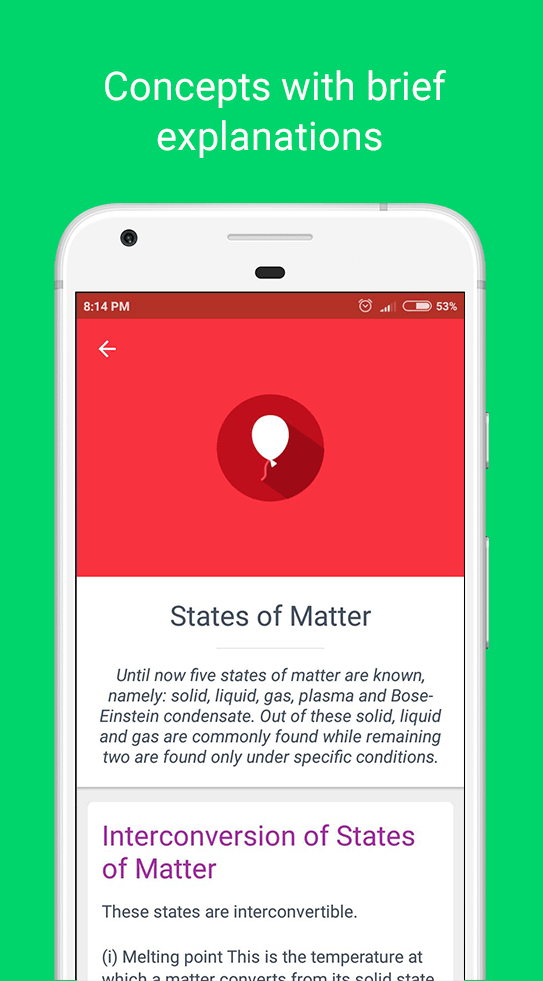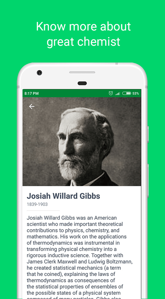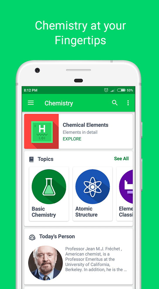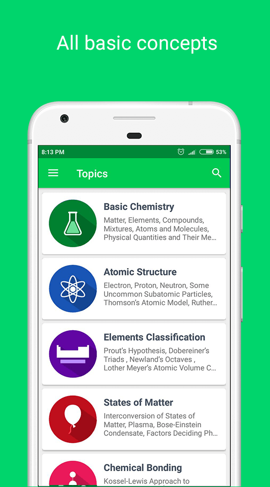 - Conceptos Vitales Explicados: Los temas esenciales de química se introducirán a los usuarios gradualmente. También está organizado según la dificultad y claramente ilustrado con ejemplos y ecuaciones.