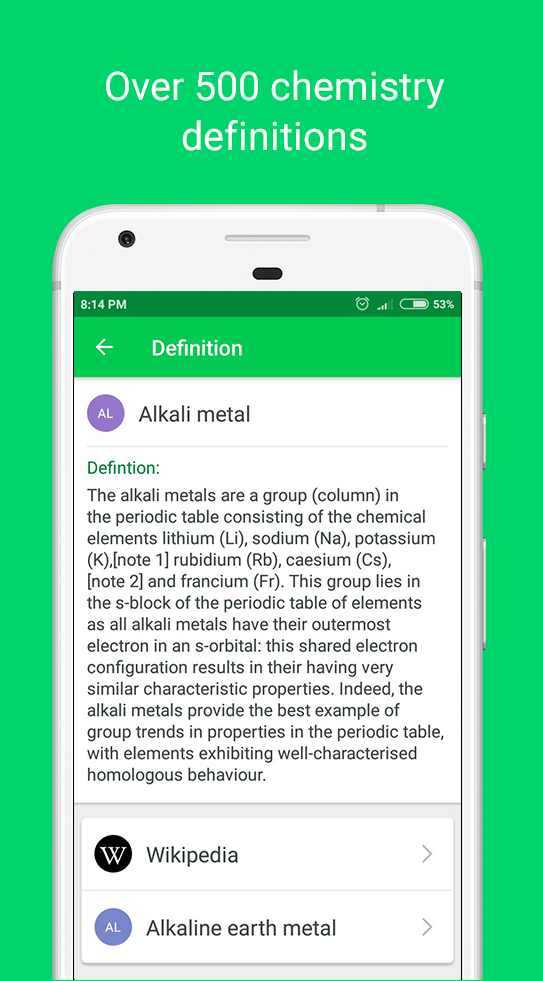 - Diccionario de Química Extenso: La biblioteca de la aplicación posee más de 500 términos con definiciones claras. Esto es completamente adecuado para aquellos que ya no tienen una base clara en esta materia.