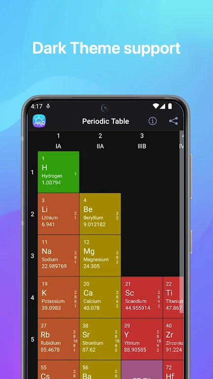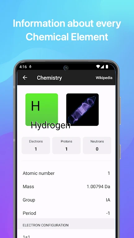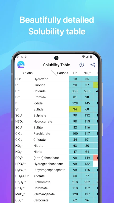 Finalmente puedes guardar esos pesados y anticuados libros de química. La aplicación Chemistry incluye múltiples gráficos y tablas dinámicas. El gráfico de electronegatividad, la tabla de solubilidad e incluso la madre de todas las herramientas científicas, la Tabla Periódica, son accesibles con un simple toque. Estas imágenes no son solo estáticas; también son escalables y fáciles de interactuar. Puedes acercar el zoom tanto como quieras para examinar detalles minúsculos. Imagina tener una lupa, pero para el mundo de la química.