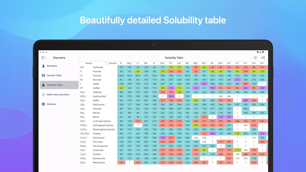 Hablemos de la aplicación Chemistry, como una navaja suiza para químicos. La Tabla Periódica de Mendeleev, una Tabla de Solubilidad y una Calculadora de Masa Molar se encuentran convenientemente en este único recurso. ¿Y lo más importante? Es más que una simple aplicación para resolver ecuaciones; es un minilaboratorio de química que puedes llevar en el bolsillo.