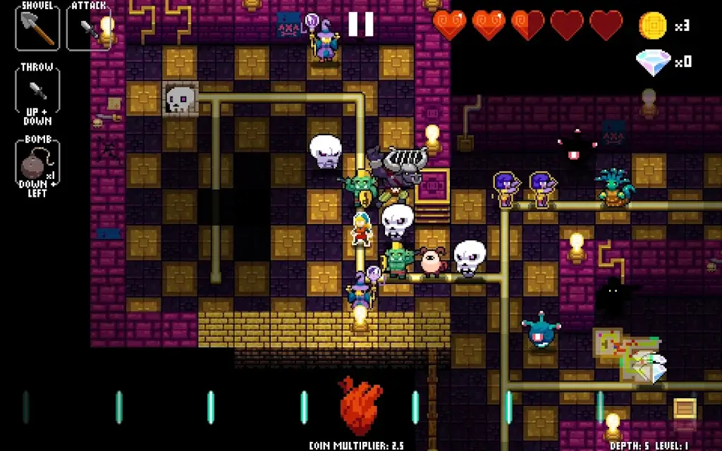 El mecanismo de juego original de Crypt of the NecroDancer se basa en sincronizar tus movimientos y ataques con la música. A diferencia de los juegos más típicos donde tienes control total sobre tu avatar, cada uno de tus movimientos en este viaje rítmico debe caer al compás de sonidos contagiosos. Cada ataque debe ser cronometrado con precisión para mantener tu ritmo y combo, ya sea que estés cortando oleadas de oponentes o esquivando trampas letales. La estrategia y la sincronización se vuelven esenciales para tu éxito a medida que el juego se transforma en una danza hipnótica. Suéltate en el campo de batalla rítmico atándote los zapatos de baile.