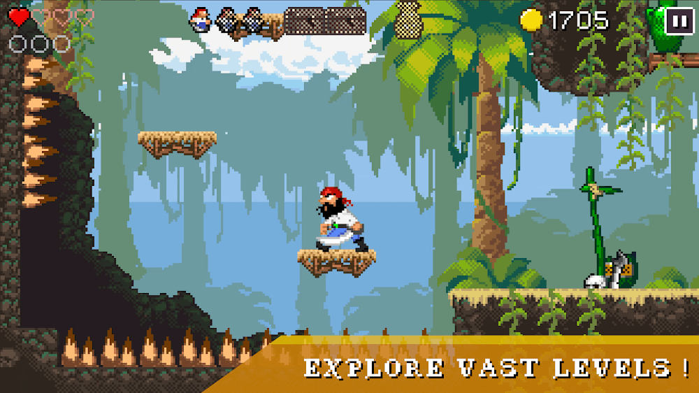 Cutlass and Coins es uno de los icónicos plataformeros de la vieja escuela con fascinantes temas piratas para brindarte un disfrute sin fin mientras buscas nuevas tierras y acumulas todos los tesoros. Cuanto más te adentres en el océano, más contenido emocionante se desarrollará y dejará profundas impresiones de un verdadero pirata grabadas en tu mente.