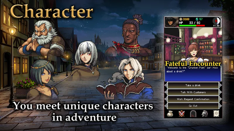 El artista de la serie, Ginoya, está de vuelta, esta vez representando el mundo en un arte de puntos extraordinariamente detallado. Animaciones más vivas y puntos más pequeños crean una estética nítida y matizada. Iluminación y sombras vibrantes dan vida a los entornos. El arte rediseñado de personajes y monstruos añade estilo. Ya sea el encanto rústico del pueblo o los ominosos pasillos de las mazmorras, DarkBlood2 es un deleite visual. El nuevo referente visual de la serie.