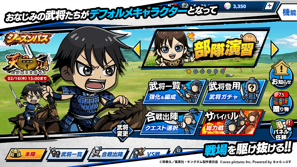 Kingdom Dash presenta a todos los conocidos señores de la guerra del anime de TV "Kingdom", como Shin y Li Mu. ¡Personaliza tu unidad, trascendiendo fronteras nacionales para crear la fuerza más poderosa! Al participar en batallas, tus comandantes militares subirán de nivel, y con el equipo adecuado y el "despertar", ¡pueden volverse aún más fuertes!