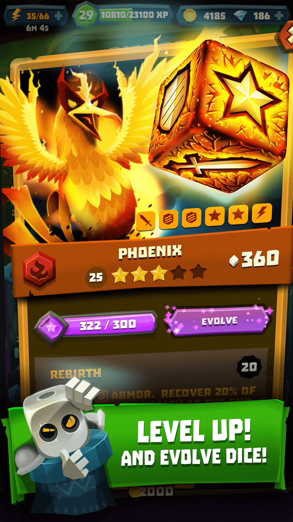 - Evolución estratégica de dados: Evoluciona tus dados para desbloquear poderes ocultos y habilidades especiales. Evolucionar tus dados no solo se trata de hacerlos más fuertes, sino que es una parte importante de la estrategia. Cada decisión que tomas afecta cómo construyes tu equipo y cómo manejas diferentes situaciones.