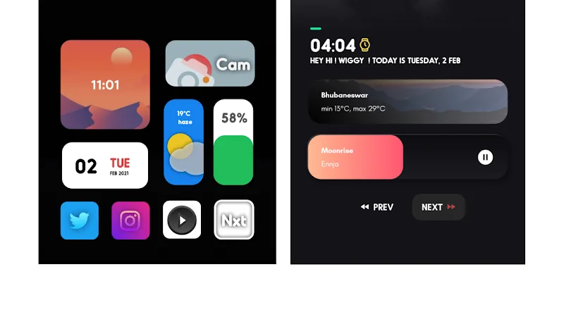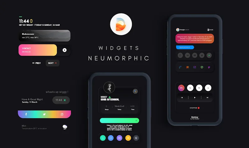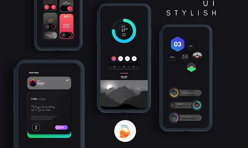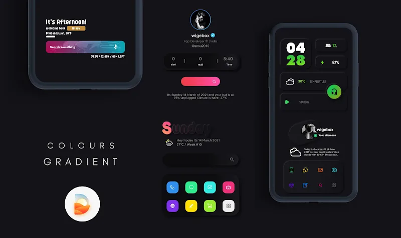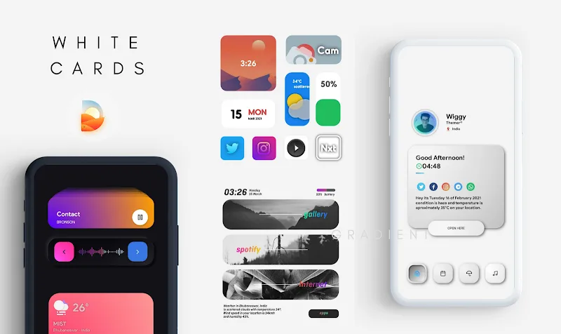 - Diseño basado en gradientes: Widgets con forma de tarjeta con una variedad de transiciones de color únicas. Fondos de pantalla dinámicos de tu elección para usar como papel tapiz. La tienda de temas de la aplicación también es muy rica, puedes elegir libremente.
