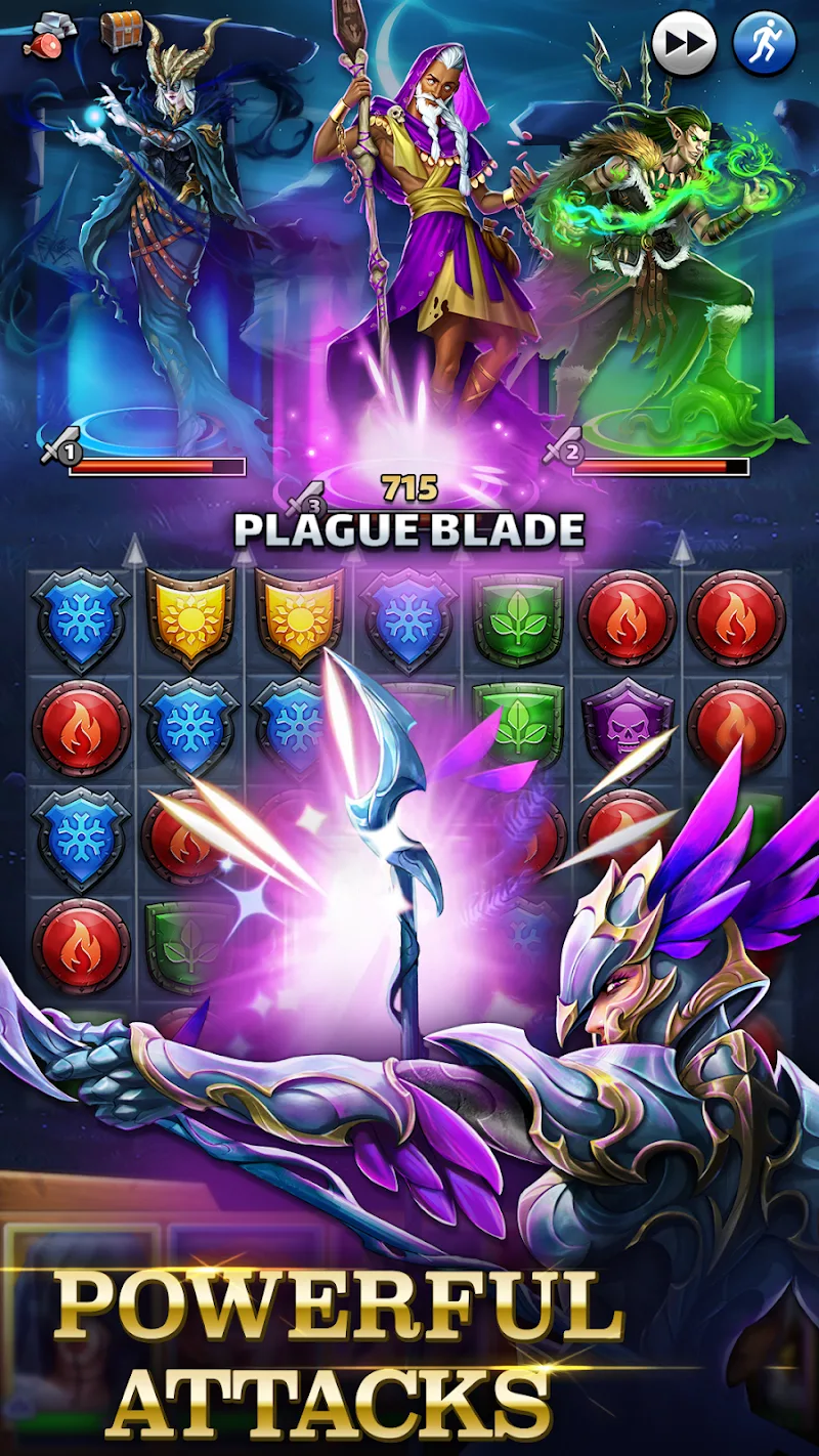- Combos de Hechizos Devastadores: Los jugadores pueden combinar escudos coloridos en los desafíos match-3 para crear combos de ataque devastadores.