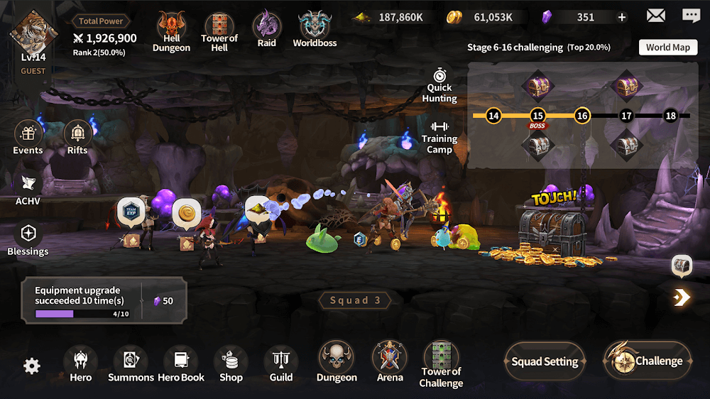 La emoción no se detiene en la Arena. Cada mazmorra y torre en Epic Fantasy está llena de objetos valiosos esperando ser descubiertos. Cada tarea es diferente, y cada mazmorra es más oscura y profunda que la anterior. Así que pon tu cara valiente y emprende una aventura que solo los más valientes intentarían. Las recompensas son tan satisfactorias como las pruebas, proporcionando a tus héroes equipos costosos para mejorar sus habilidades. Toma el control de inmediato para avanzar en tu viaje de fantasía épica.