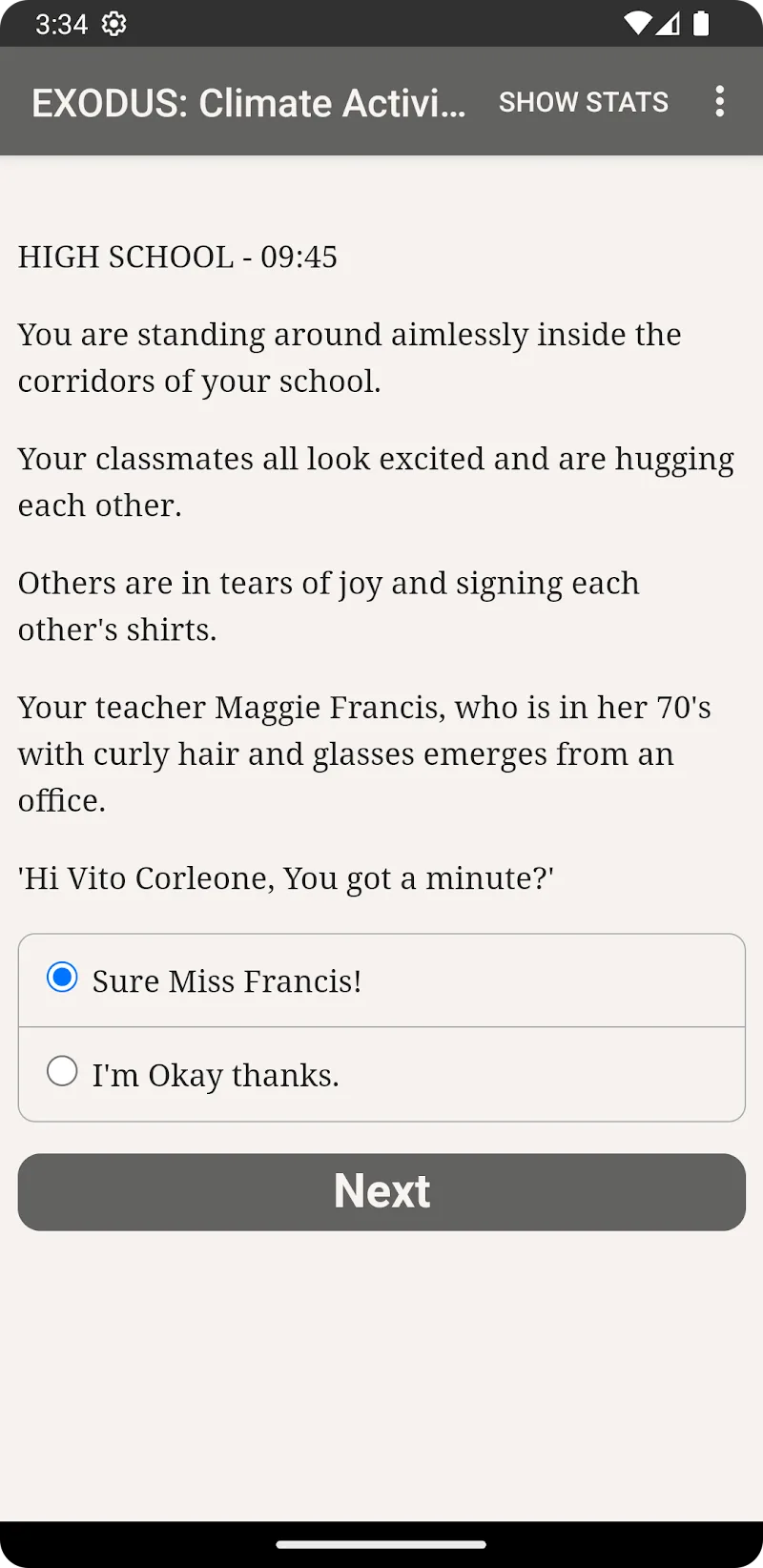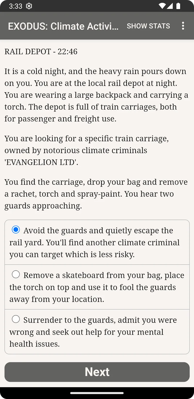 EXODUS: Climate Activist es un juego extremadamente nuevo del género de rol interactivo. Lo especial es que este juego no tiene absolutamente ningún gráfico ni sonido como otros juegos normales y este juego se opera leyendo el contenido e imaginando los detalles en él. Este juego despertará tu imaginación y te dará una experiencia como nunca antes.
