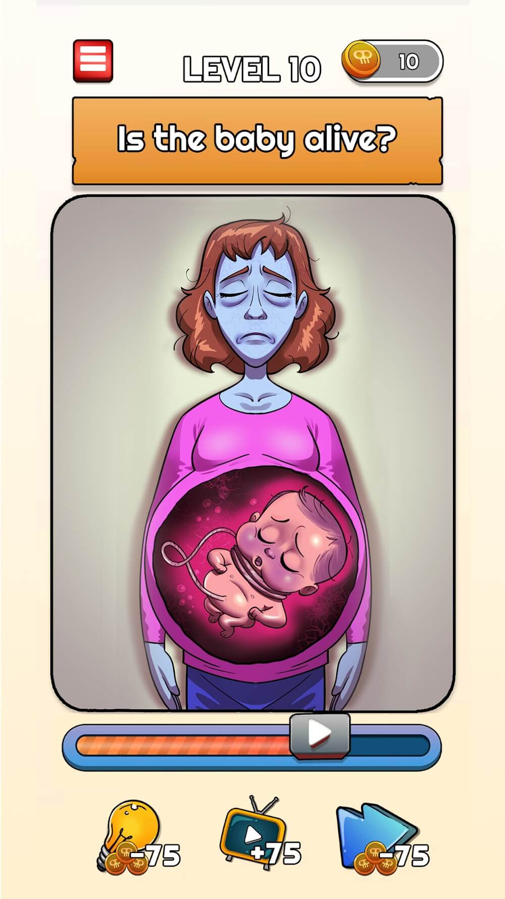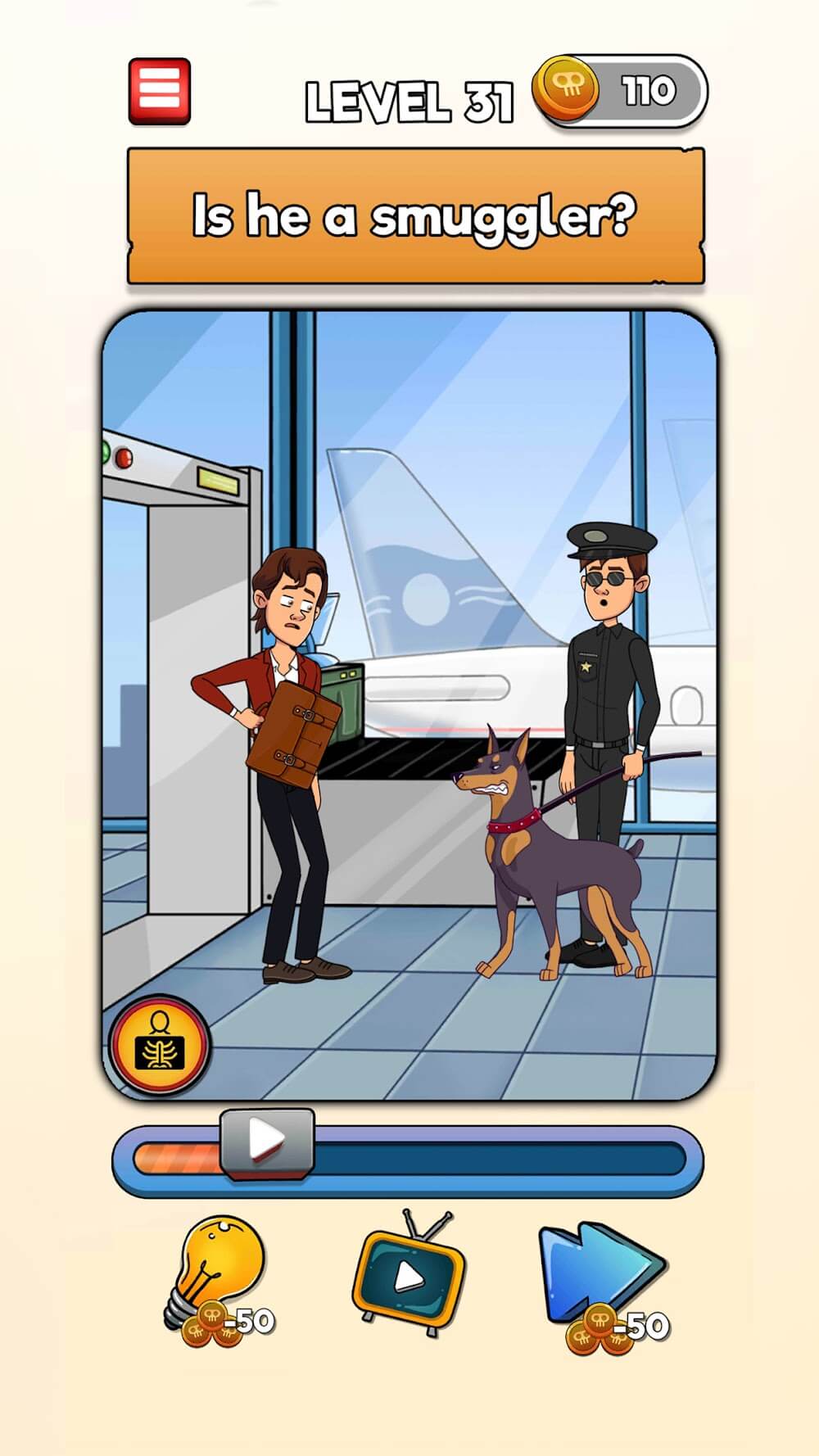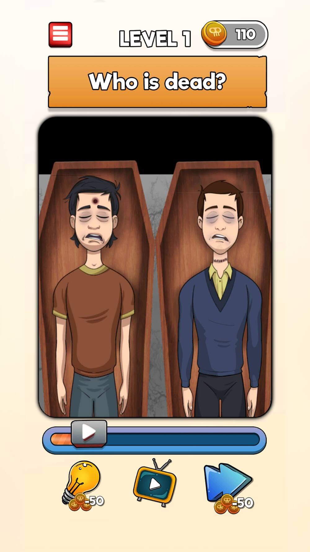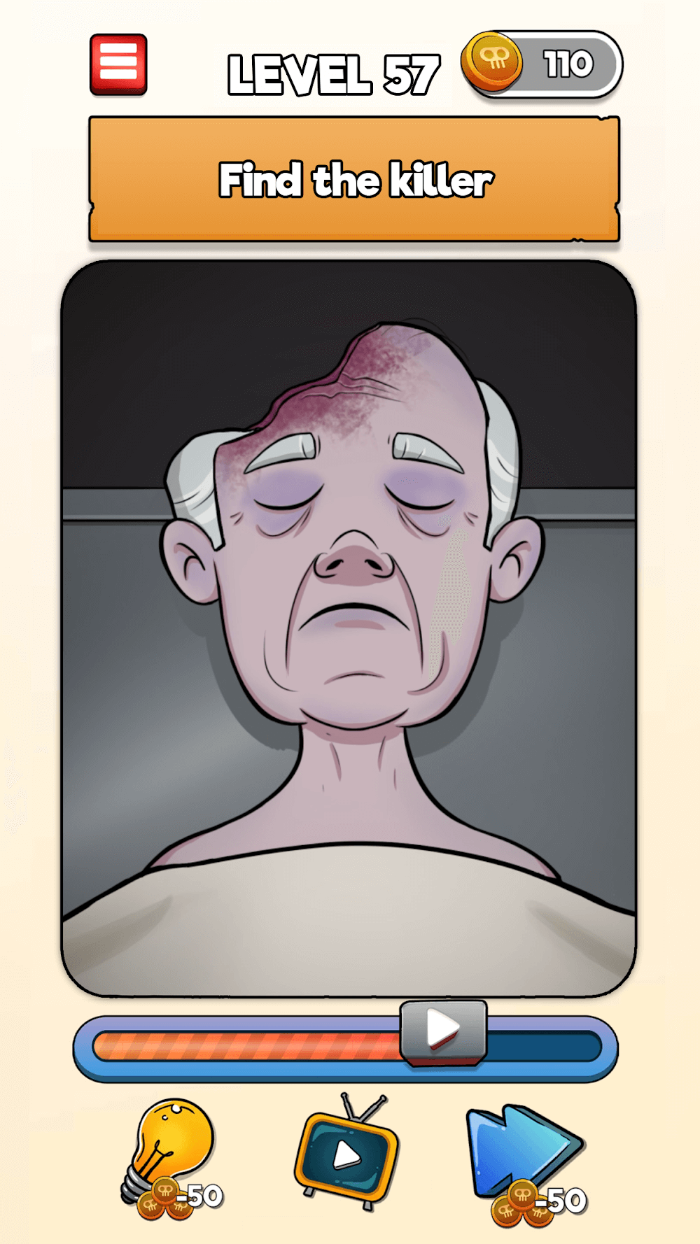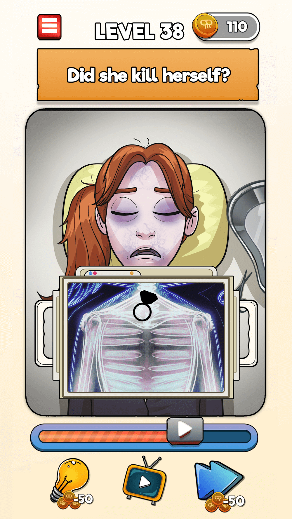 En el nivel 1, encuentra quién está muerto, y así sucesivamente; tus tareas son como, ¿está vivo el bebé? ¿Se dio cuenta ella del tren? ¿Está él vivo? ¿Encuentra al asesino? ¿Quién está muerto? ¿Es él un contrabandista? ¿Encuentra al embrujado? Toca el objeto que la mató; ¿hizo trampa? etc. De esta manera, cada nivel tiene preguntas para encontrar las soluciones. Puedes recolectar bonificaciones diarias por hasta 7 días. Para gestionar esas recompensas, juega continuamente durante siete días sin interrupciones. También puedes obtener pistas gratis, o si es necesario, puedes comprar consejos extra con las monedas ganadas. Haz clic en la flecha lateral para saltar al siguiente nivel sin encontrar la respuesta de ese nivel, y puede costar cierta cantidad. Los niveles iniciales son como un calentamiento para la capacidad de pensamiento de tu cerebro; más adelante, los niveles son difíciles de resolver y son complicados.