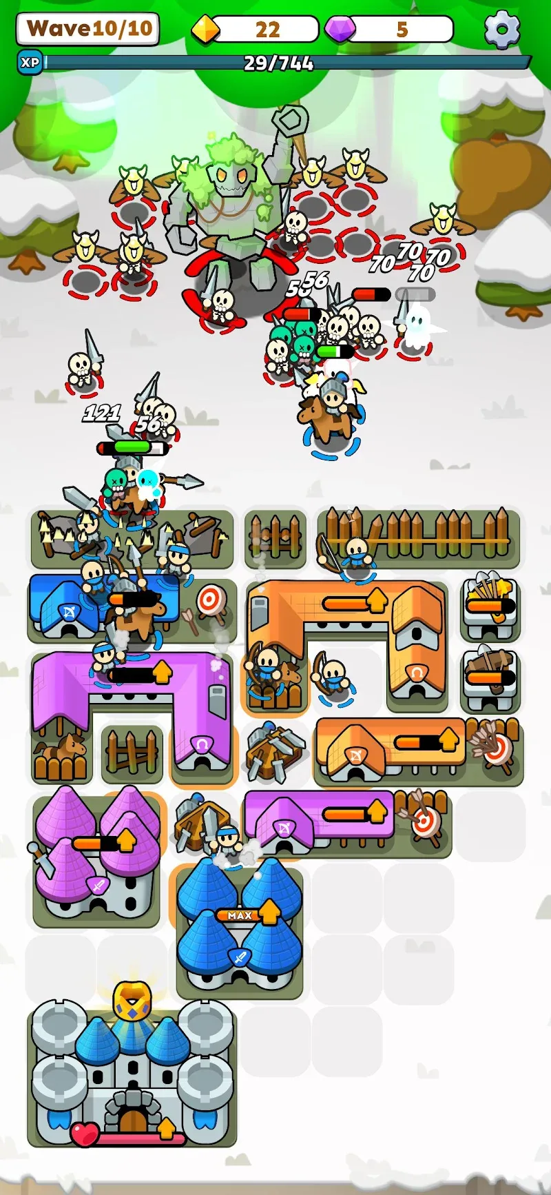 Este juego ha combinado perfectamente el mecanismo de fusión y la defensa de torres. Fortress Merge: Puzzle Defense es como otros juegos de defensa de torres, donde hordas de monstruos intentan acercarse a tu casa. Cuando irrumpan en la casa, definitivamente perderás. Pero la preparación terminará antes de que los monstruos irrumpan; esa es la diferencia. Cada nivel tendrá más de 3 oleadas. Entre cada oleada, tendrás un intervalo para encontrar diferentes piezas para mejorar tu edificio. Dos piezas idénticas mejorarán un edificio para convertirlo en uno más fuerte.