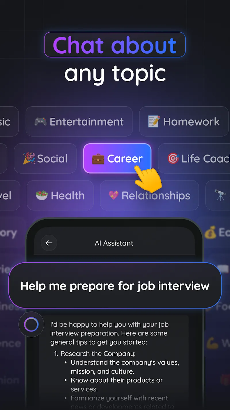 - Acceso Inteligente Rápido: La aplicación proporcionará acceso instantáneo a una enorme base de conocimientos sobre muchos temas diferentes.