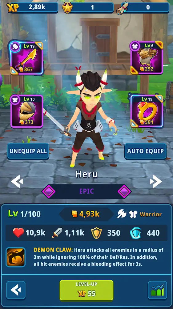 El factor crítico que afecta la victoria tras cada partida es idear estrategias inteligentes y agudas. Con las batallas posteriores en Idle Dungeon Manager, necesitas cambiar tus tácticas para adaptarte a cada situación diferente. Primero, encuentra la manera de organizar la posición de los héroes en el camino más razonable y explota su poder en la batalla. Puedes colocar a los héroes con buena defensa en la parte delantera, y el artillero estará en la retaguardia para apoyar. Dependiendo de cada encuentro, debes desarrollar tácticas perfectas para aplicarlas de la manera más efectiva.