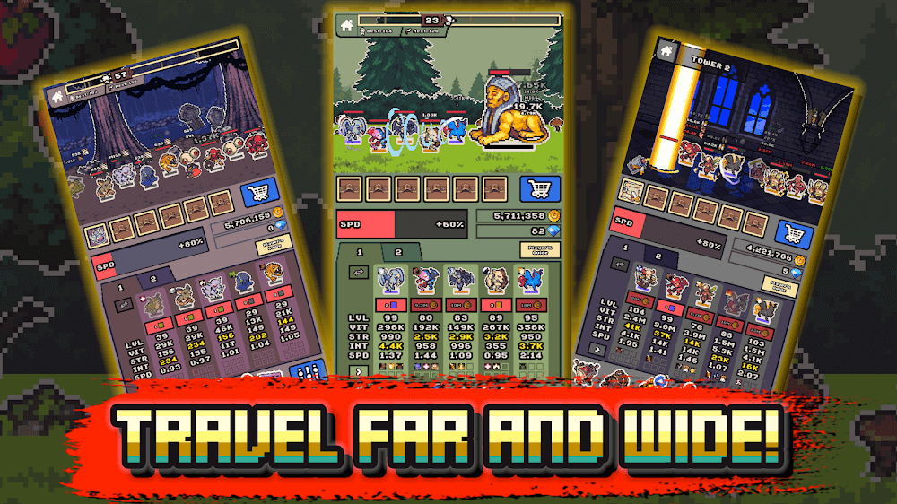 Un monstruo de los Reinos Exteriores te ayuda a derrotar a la Oscuridad, y ha conseguido algunos monstruos para que formes tu primer equipo. Alinea a los monstruos para que los enemigos sean derrotados desde los más robustos hasta los más débiles, en primer lugar, y así sucesivamente en orden descendente. Un elefante es el mejor monstruo inicial para derrotar a los monstruos enemigos. Puedes usar los botones de viaje en la parte superior para enviar a tu monstruo a luchar en el campo y acelerar a tu monstruo tocando en el área del mundo superior. Cada monstruo que derrotas tiene la posibilidad de soltarse a sí mismo y vale la pena conservarlo. Si los miembros de tu equipo caen, entonces revívelos en tu base de operaciones. En cada nivel, la dificultad aumenta, así que mejora a tus monstruos con el oro recolectado.