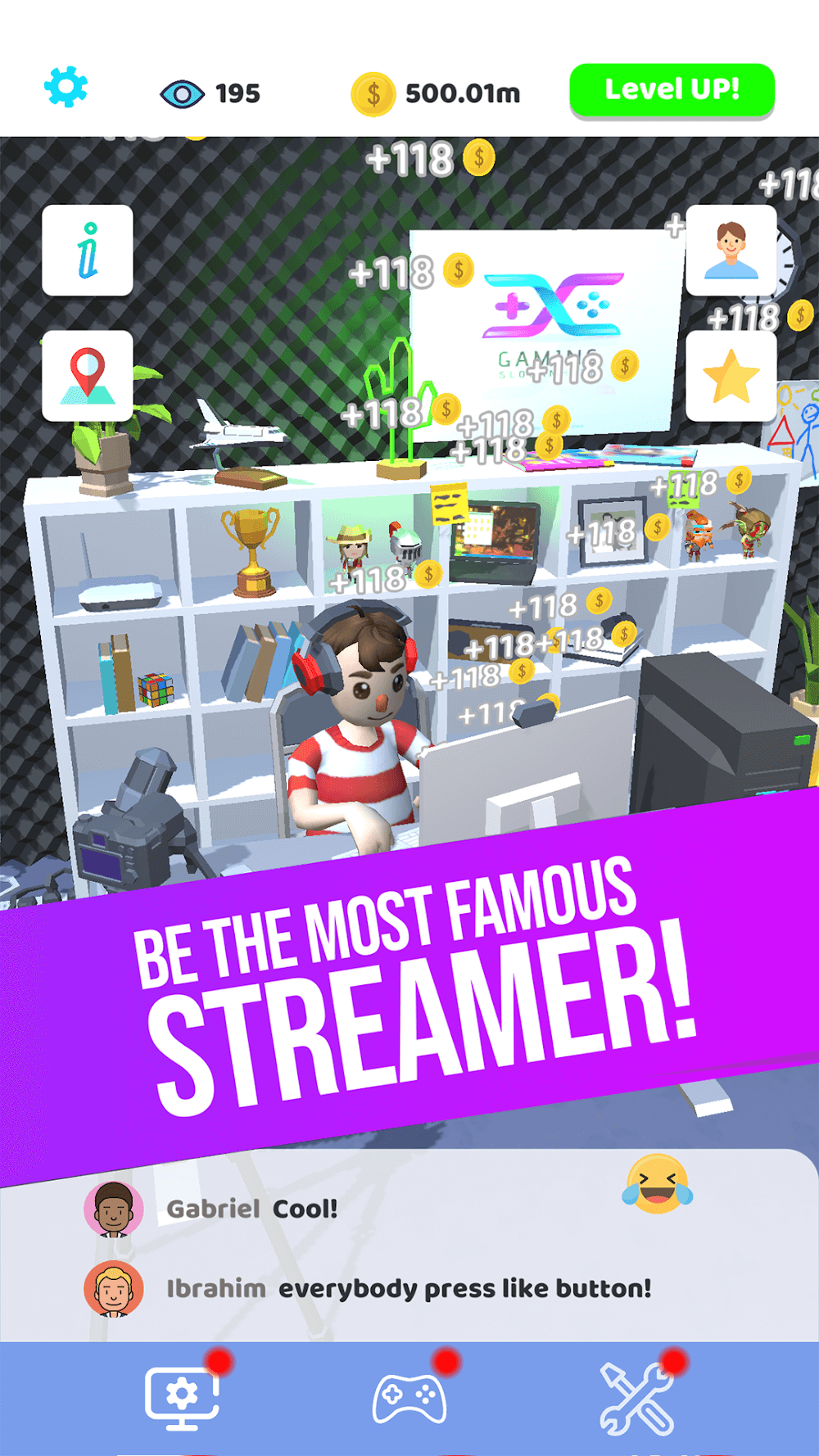 Idle Streamer! ayudará a los jugadores a tener la oportunidad de cumplir su sueño de convertirse en streamers famosos y ganar mucho dinero con el trabajo de streaming. No todo el mundo puede convertirse rápidamente en streamer sin habilidades para los videojuegos o sentido del humor, por lo que este juego te ayudará a experimentarlo. Deberás pasar horas transmitiendo contenido emocionante para tus fans y atrayendo muchas visualizaciones.