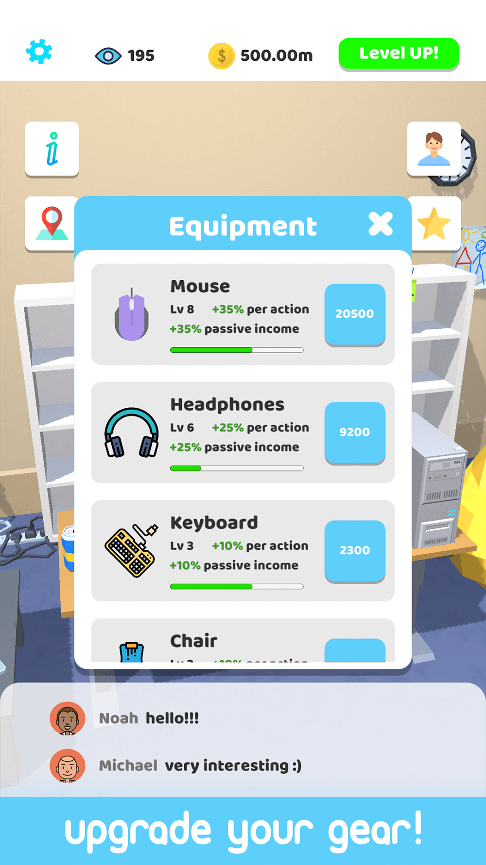 Para tener éxito como streamer en Idle Streamer! entonces tienes que invertir en tu sala de streaming con algún equipo esencial. Durante las transmisiones en vivo, es imperativo tener una computadora con una cámara y un micrófono de calidad para que los espectadores puedan verte claramente y escuchar lo que dices. También puedes usar tu dinero para mejorar la sala de streaming para que sea más espaciosa y decorar algunos artículos más necesarios. Eso te ayudará a retener más espectadores y obtener las transmisiones en vivo más efectivas.
