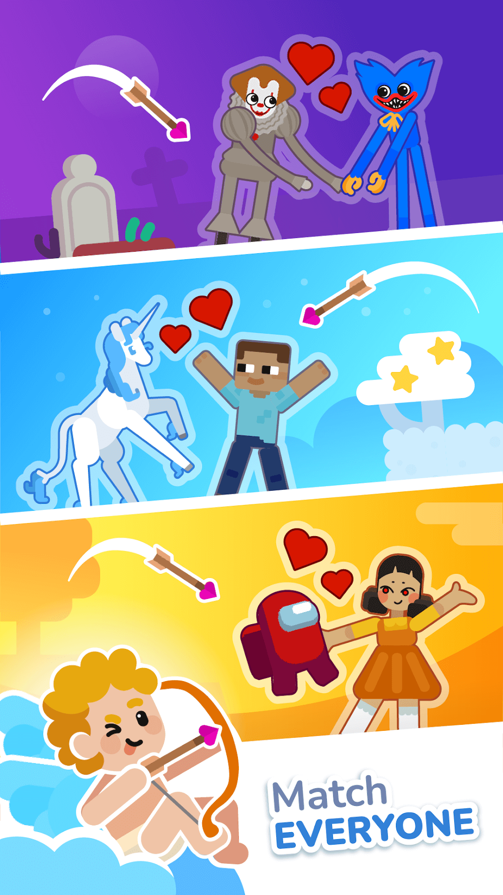 El juego te proporciona un arco y flechas para que emparejes a parejas o criaturas. No solo eso, necesitas encontrar similitudes entre dos objetos entre los muchos que aparecen en el marco. Usa tu habilidad de disparar flechas para unir dos objetos y construir una nueva historia de amor, más romántica que nunca.