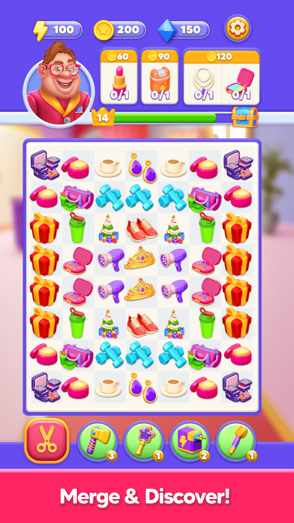 Cuando vengas a Merge Studio, verás una matriz de rompecabezas de combinar 3. Fusiona cuadrados con el mismo símbolo en una sola columna. Desaparecerán instantáneamente si se combinan tres cuadrados, pero se generará una fuerza explosiva si se combinan cuatro o cinco cuadrados. En primer lugar están los artículos de cuidado personal como maquillaje, secadores de cabello y varios artículos de ropa y calzado. El jugador debe recolectar suficientes recursos para proporcionar al cliente las herramientas necesarias para mudar. Antes de pasar al siguiente nivel, debes recolectar ciertos artículos. El hacha, el martillo y la estrella pueden romper fichas que te impiden completar una línea.