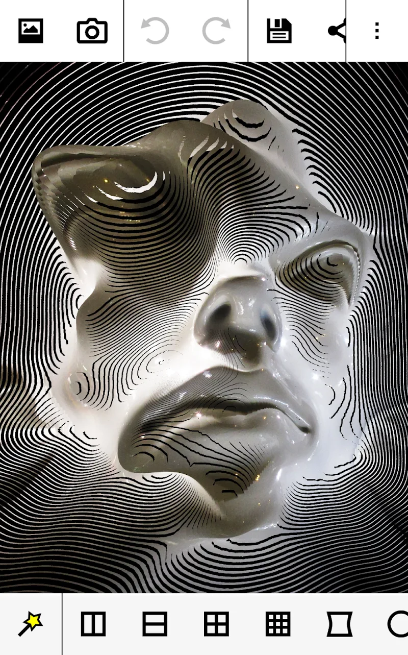 La amplia gama de opciones de edición son intuitivamente accesibles. Los efectos se colocan mediante gestos táctiles de arrastre. Los parámetros comunes – intensidad, rotación, relación de aspecto, amortiguación – son consistentes en todos los filtros, haciendo que la experimentación sea fluida. Las capas aplican filtros sobre filtros para imágenes compuestas. Una programación inteligente hace que la manipulación se sienta natural. El botón de deshacer permite una creatividad sin riesgos.