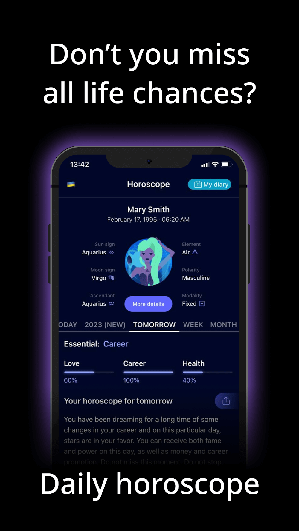 - Predicciones personalizadas: Los usuarios pueden personalizar la fecha de nacimiento, el lugar de nacimiento o la información personal, y la aplicación inmediatamente te proporciona predicciones de horóscopo personalizadas.