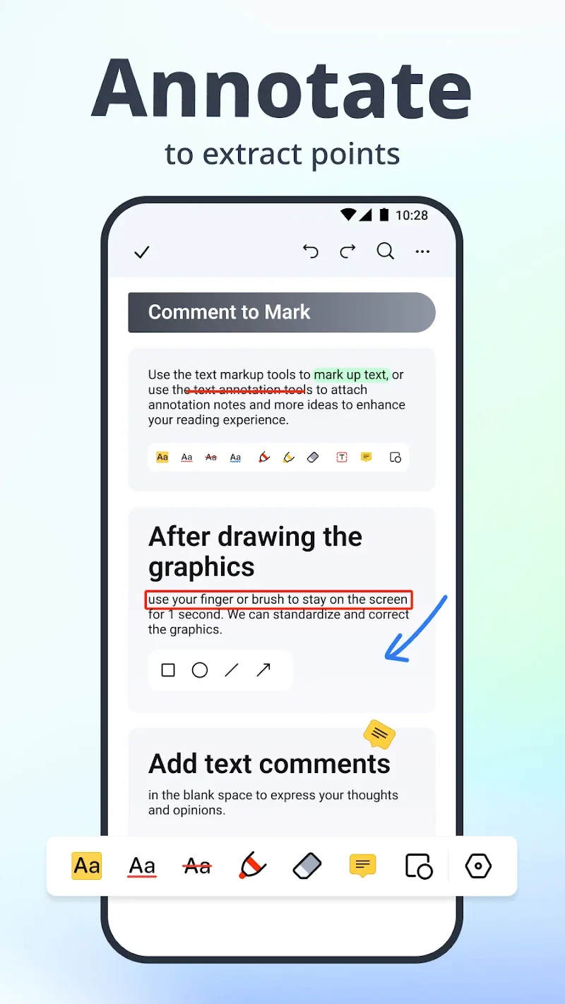 La aplicación también cuenta con herramientas de anotación para archivos PDF. La aplicación resaltará automáticamente las ideas principales del contenido textual del archivo PDF por ti. También puedes añadir o eliminar fácilmente créditos en el contenido de los archivos PDF.