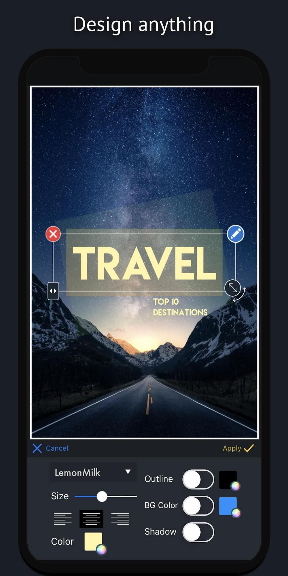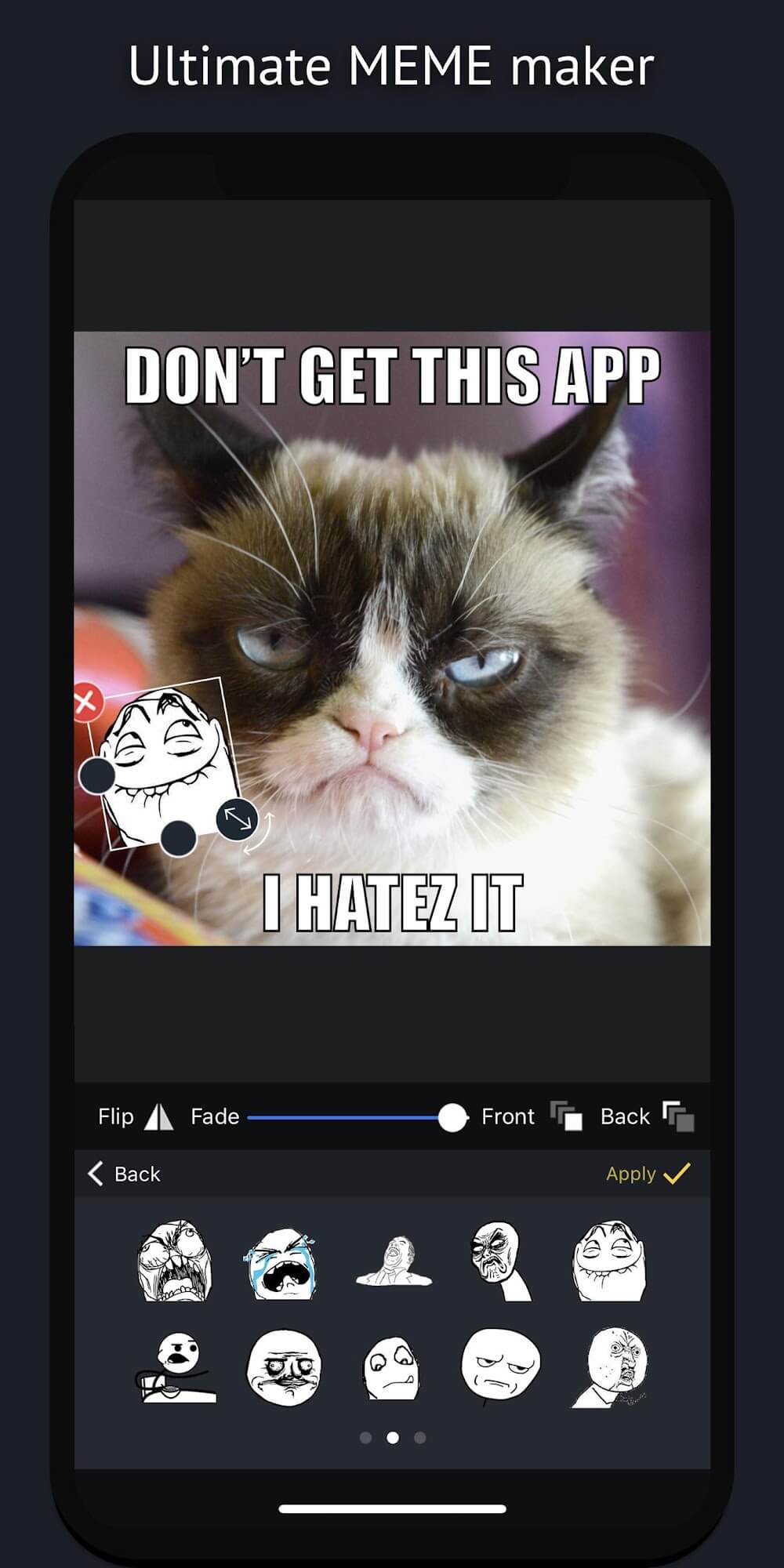 Las creaciones impresas y para medios ahora pueden editarse libremente en tu dispositivo móvil, eliminando la necesidad de diseñadores profesionales. PiZap Editor de Fotos, Creador de MEMEs nos permite añadir texto a las imágenes y mover el texto a la posición deseada en el marco. Una diversa gama de fuentes en varios colores y tamaños da vida a tu trabajo con una gran cantidad de información adicional. Dado que la función de inserción de texto puede cambiar el diseño de la imagen, debes emparejar cuidadosamente el estilo y tamaño de la fuente con el fondo de la imagen. Elige colores de fuente y fondo más contrastantes, o edita el color según lo desees, para evitar dificultar la lectura.