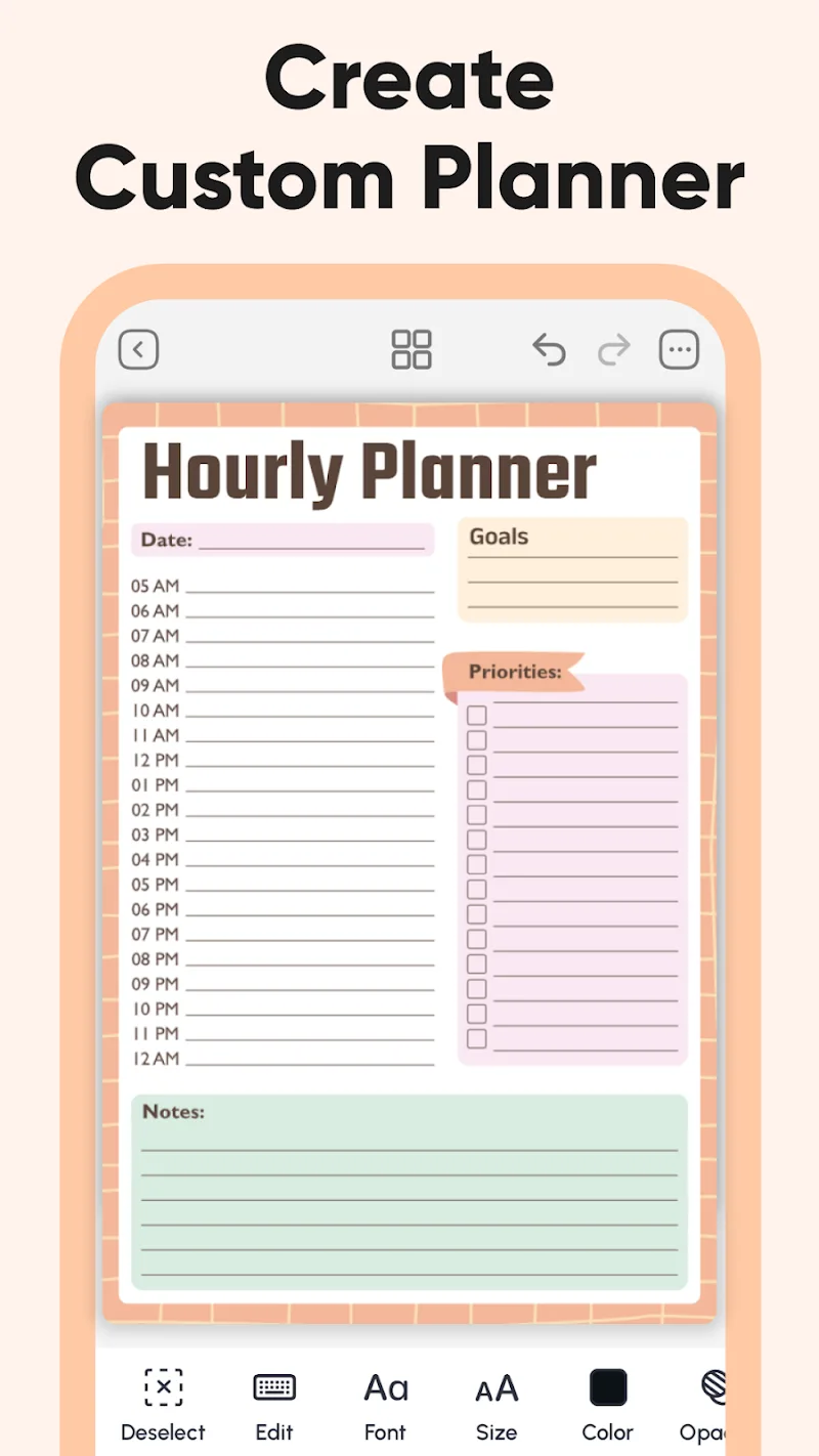 Cada página del horario se diseñará según las preferencias del usuario. La aplicación les ayuda a crear muchas versiones diferentes del plan. Cada parte del horario es ajustada por el usuario en tiempo real. Pueden agregar muchas actividades nuevas. El horario ayudará a los usuarios a predeterminar su trabajo diario.