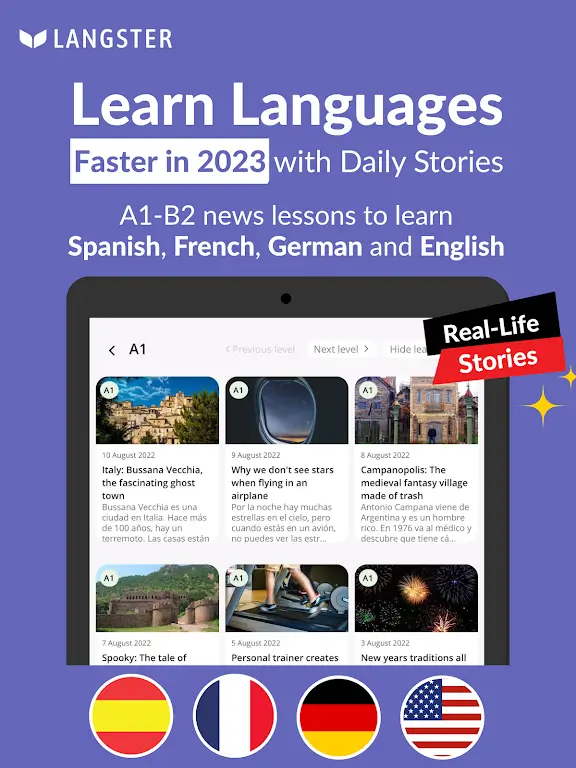 Readle (ex—Langster) Languages será una herramienta para apoyar el aprendizaje de idiomas extranjeros a través de historias reales e impresionantes. La aplicación es cada vez más moderna y actualizada con muchas funciones nuevas para satisfacer las necesidades de los usuarios. Proporcionar contextos de la vida real y tener más formas de manejar situaciones en nuevos idiomas te ayudará a comprender mejor el idioma que elijas.