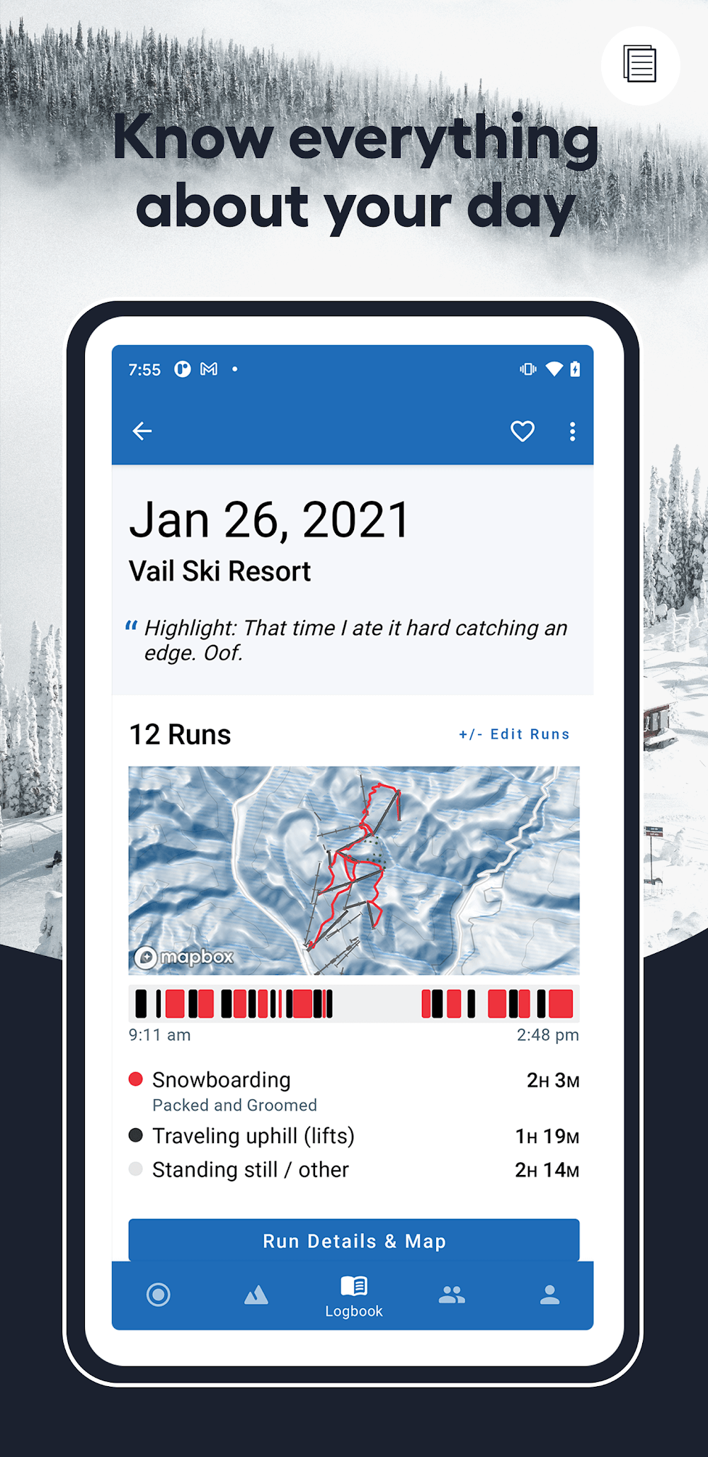 Con Slopes, ¡puedes aprovechar al máximo tu tiempo libre gracias a la nieve! Esquía y haz snowboard con tus amigos, lleva un diario de tus recuerdos y revive juntos tus aventuras invernales, todo mientras aprendes estadísticas detalladas (y te ganas el derecho a presumir) sobre tu tiempo en las pistas.