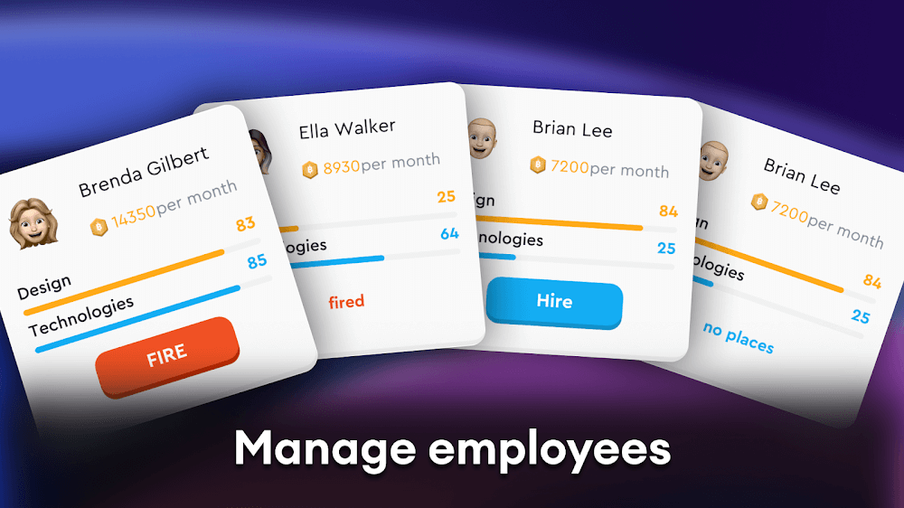 Tienes acceso a una amplia gama de profesionales disponibles para contratar dentro de Smartphone Creator Tycoon inc para ayudarte a desarrollar tu empresa. Todos los candidatos tienen experiencia en diseño o tecnología; todo lo que necesitas hacer es revisar sus currículums para seleccionar al candidato que mejor se adapte a tu equipo. Cuanto mayor sea el nivel de experiencia de un trabajador, mayor será su salario inicial. Esta característica es esencial para el juego porque el rendimiento de tu empresa puede verse significativamente afectado por el grupo de profesionales que reúnas.