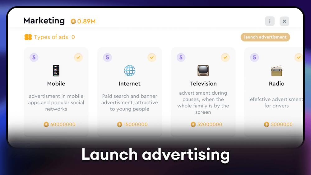 El marketing es otro componente esencial del juego, ya que es un factor clave para persuadir a los clientes para que compren tus atractivos teléfonos inteligentes. Puedes vender tus atractivos teléfonos inteligentes invirtiendo dinero en publicidad exterior como vallas publicitarias, bancos de autobús y otra publicidad exterior, así como encargando anuncios de radio o televisión. Si tus operaciones de marketing son más exitosas, los clientes se sentirán atraídos por tu marca con más frecuencia, lo que conducirá a más ventas.