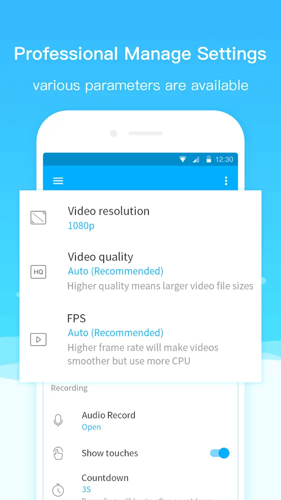 Screen Recorder+Video Recorder te ofrece una grabadora de video moderna que sirve para muchos propósitos diferentes. La aplicación siempre estará en modo HD de alta calidad, y siempre se cumplirán imágenes nítidas y sonido realista. La aplicación también te permite configurar la función de grabación automática estableciendo el tiempo; cuando llegue ese marco de tiempo, grabará automáticamente y guardará en la categoría adecuada para el propósito de uso.