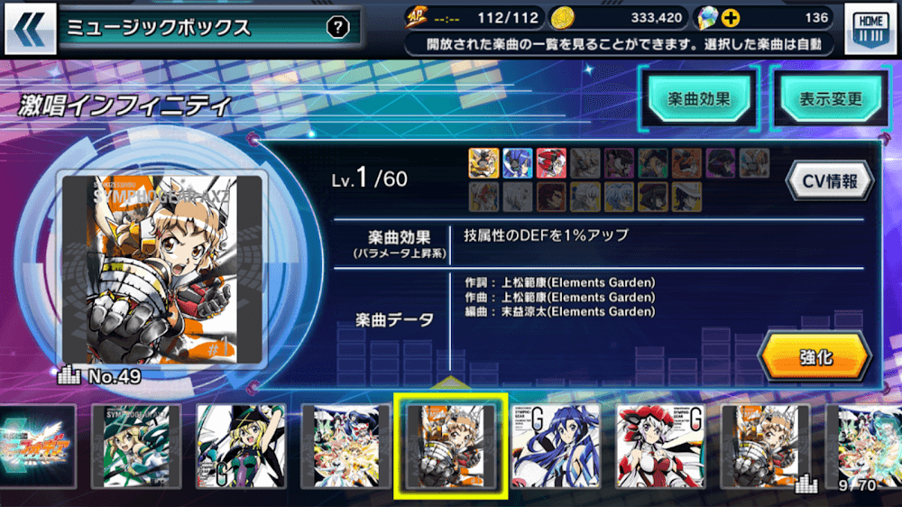 Uno de los aspectos más atractivos de Symphogear XD UNLIMITED es la inclusión de música de Elements Garden, un renombrado equipo de producción musical. Su talento excepcional brilla en el juego al ofrecer una banda sonora cautivadora que realza cada momento de tu partida. Sumérgete en una sinfonía de melodías que complementan perfectamente la intensa acción y las narrativas emocionales. Ya seas fan de las canciones originales del anime o simplemente disfrutes de música de alta calidad en tu experiencia de juego, Symphogear XD UNLIMITED cumple en todos los frentes.