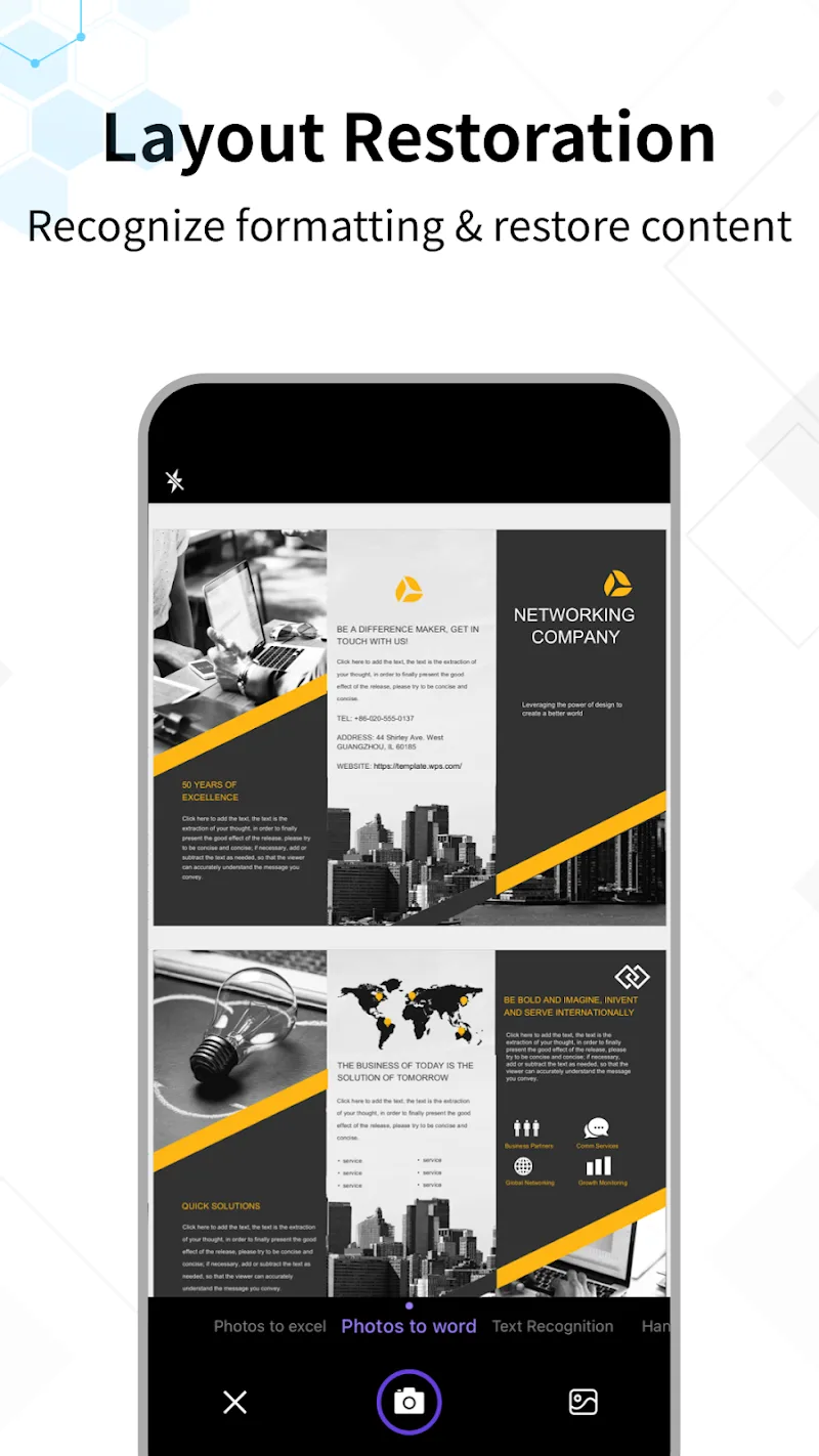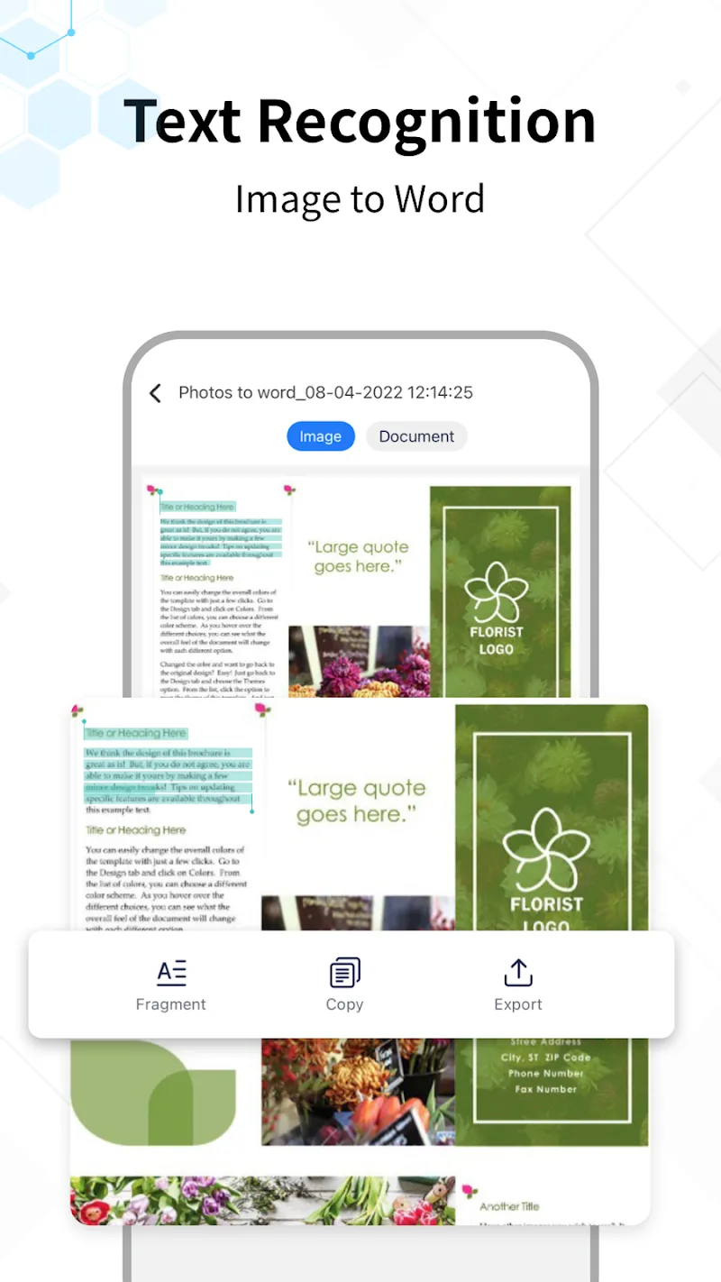 Text Extractor extrae todo el texto visible en una imagen, incluso si está inclinado o deformado. Una vez extraído, puedes copiar, editar y compartir los resultados del reconocimiento. También permite escanear múltiples fotos por lotes para extraer texto. El texto se puede extraer de formatos de imagen comunes como JPG, BMP, TIFF y GIF. Los formatos de salida incluyen Word, Docs y texto plano.