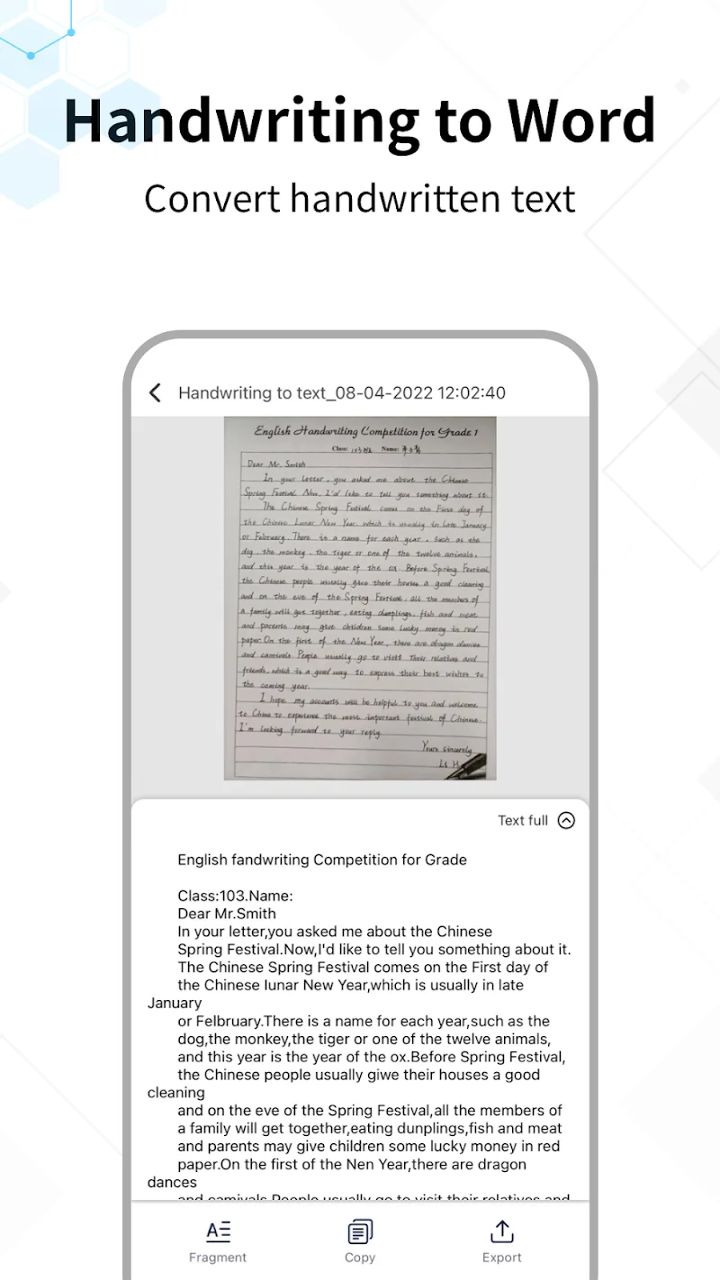 Además del texto mecanografiado, Text Extractor puede extraer palabras escritas a mano tanto de imágenes de la galería como de nuevas fotos de la cámara. El análisis OCR de escritura a mano resulta muy preciso. Puedes recortar y escanear solo porciones de texto para la conversión. Las opciones de salida incluyen nuevamente Word, Docs y archivos de texto.