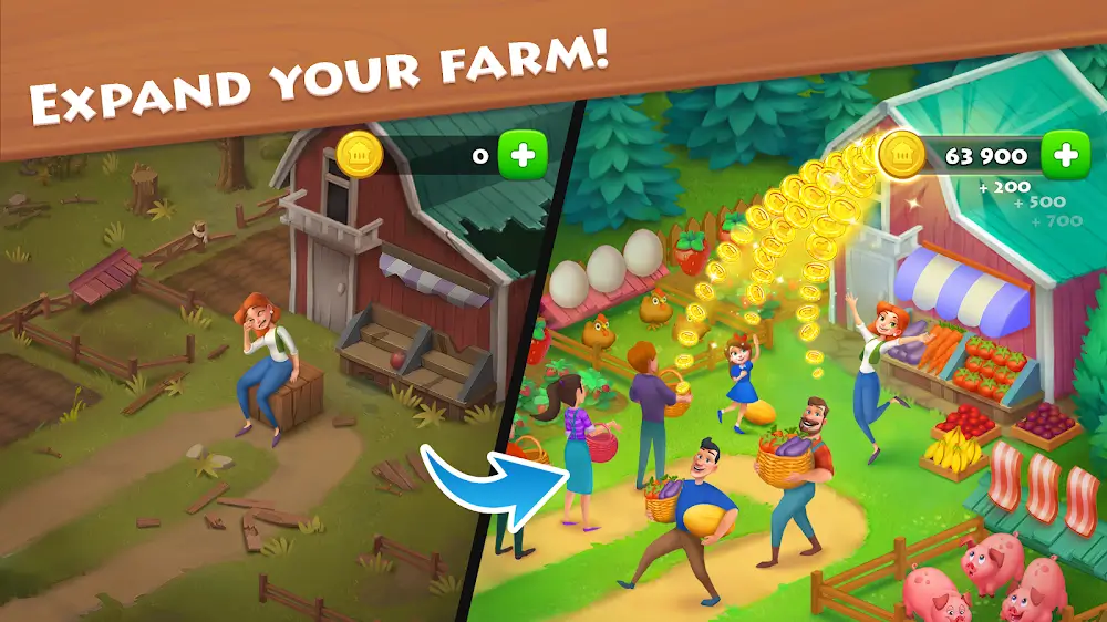 Se puede ver que el dinero que ganas a través de la granja se usará para desarrollar la ciudad, por lo que pasarás la mayor parte de tu tiempo en la granja, y luego estarán otras áreas. Al mismo tiempo, en Township, los usuarios pueden encontrar muchas formas de ganar experiencia y desbloquear nuevos edificios. En particular, tus productos, ganado y granja se expandirán para ayudarte a ganar más dinero que con productos básicos como el pan.