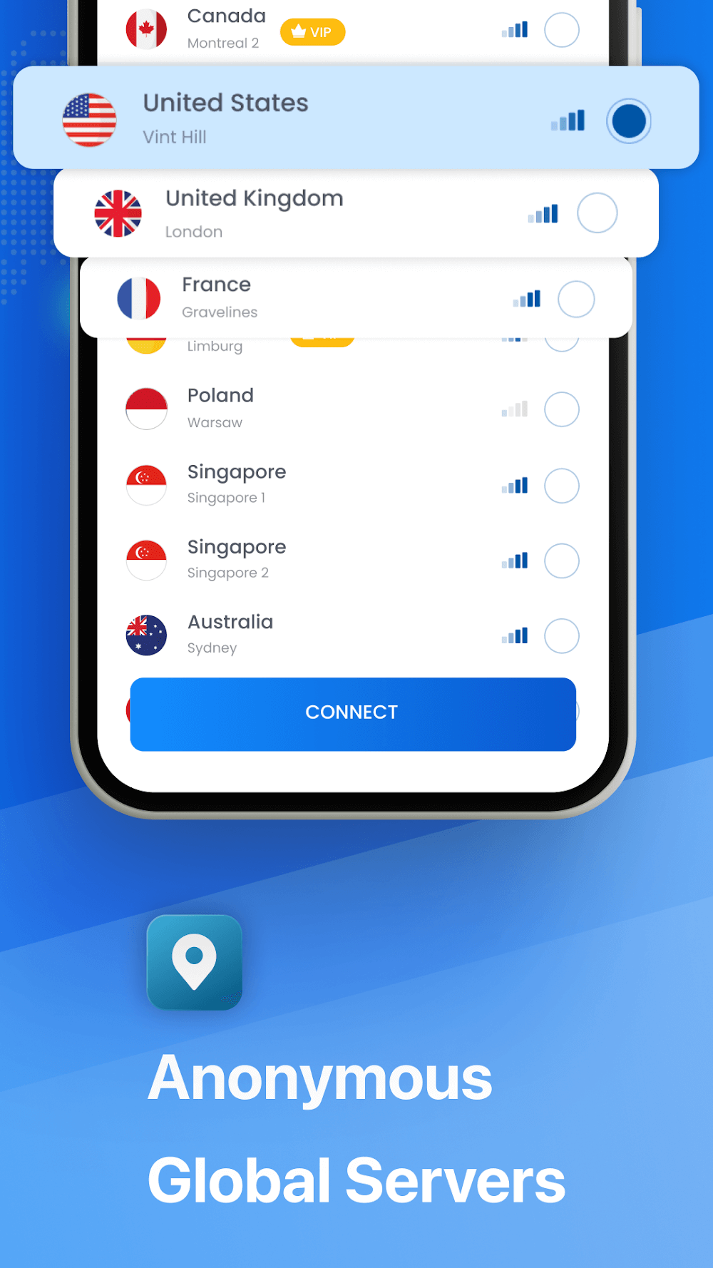 En términos de mantener el anonimato y la seguridad en línea, VPN Proxy Master - Secure VPN es una herramienta invaluable. Esta aplicación de Red Privada Virtual (VPN) está diseñada para proteger tu actividad en línea cifrando tu conexión a Internet, haciéndola privada y anónima. Cuando utilizas WiFi público, que normalmente es susceptible a ataques de hackers y otros ciberdelincuentes, la aplicación resulta extremadamente útil. Puedes conectarte a una amplia variedad de servidores en todo el mundo cuando usas VPN Proxy Master. Estas ubicaciones incluyen Singapur, Canadá, los Estados Unidos de América, el Reino Unido, Alemania, Francia y Polonia.