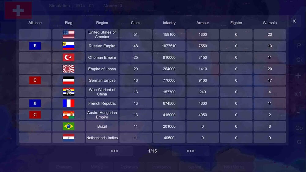 Este juego proporcionará mapas con información útil sobre las circunstancias y características de los países involucrados en la Primera y Segunda Guerra Mundial. Este mapa, que presenta un color diferente para cada país, puede ayudarte a determinar las ubicaciones de los países. Como resultado, con solo mirar el mapa y compararlo con los colores proporcionados, es posible determinar la ubicación de cualquier país del planeta. Además, el sistema del juego organizará cada ubicación en el mapa de acuerdo con el sistema de coordenadas, haciendo que buscar información sea mucho más fácil y rápido. Los jugadores también pueden cambiar fácilmente entre varios gráficos para obtener información más específica y controlar la lucha.