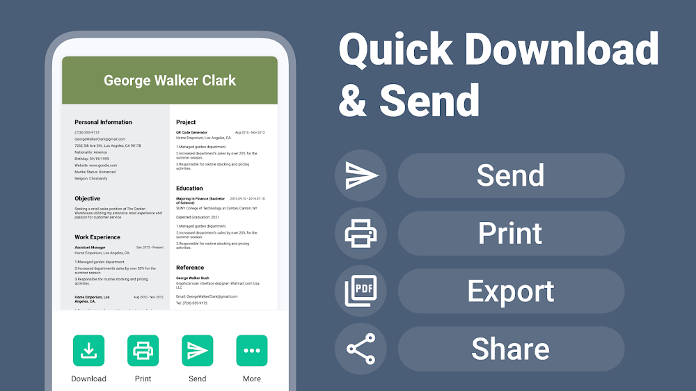 Setelah Anda mengedit dan menambahkan informasi pribadi Anda di Resume Builder & CV Maker, Anda dapat mengekspornya sebagai PDF dengan jelas dan akurat. Untuk memastikan keakuratan, Anda sebaiknya memeriksa dan melihat pratinjau resume tersebut sebelum mengekspor. Harap tinjau informasi tersebut sebaik mungkin. Selain itu, Anda dapat mengirim resume itu ke email manajer HR lebih cepat dan efisien dari sebelumnya. Setiap orang memiliki kreativitas dan gaya penulisan CV mereka sendiri. Harap merujuk aplikasi ini untuk membuat resume dengan konten yang paling terjamin dan mengesankan. Harap rekomendasikan kepada teman dan kerabat untuk digunakan guna menerima manfaat yang dibawanya.