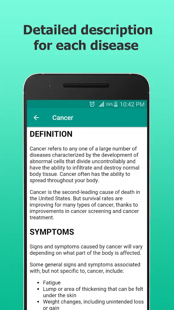 Este aplicativo irá ajudá-lo e às pessoas ao seu redor a lidar com doenças que nunca encontrou. Pode determinar de que doença você ou um ente querido está a sofrer, onde se originou, que sintomas tem e como curar-se simplesmente consultando os sintomas de certas doenças. Os artigos extremamente úteis fornecerão aos usuários mais informações sobre a doença e opções de tratamento. Nesses artigos, muitos médicos experientes fornecerão maneiras de curar e prevenir doenças, bem como dicas úteis para ajudá-lo a evitar contrair essa doença.