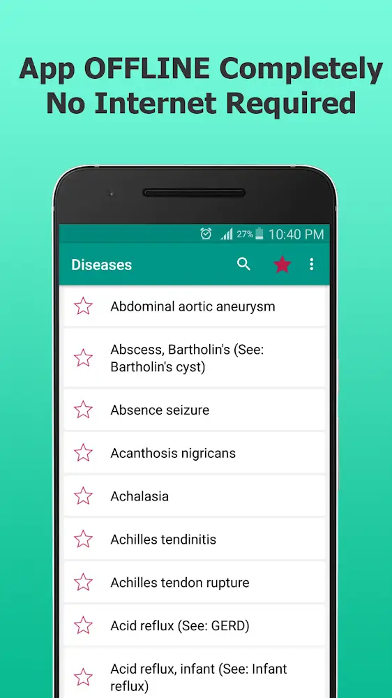 O Dicionário de Doenças Offline oferecerá aos usuários artigos extremamente detalhados escritos por médicos experientes sobre qualquer doença que possam encontrar. O aplicativo irá direcioná-lo para um breve artigo quando pesquisar uma doença. A primeira é uma definição e histórico da doença, para que saiba o que é e de onde veio, seguida de uma lista de sintomas comuns. Os usuários podem verificar se eles ou as pessoas ao seu redor estão infetados, permitindo um tratamento imediato. Os usuários também podem marcar as doenças que desejam lembrar para que possam ser facilmente guardadas e acedidas para referência futura.