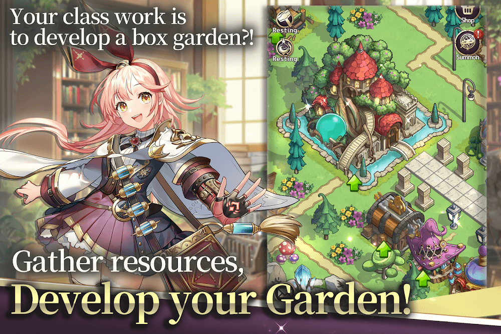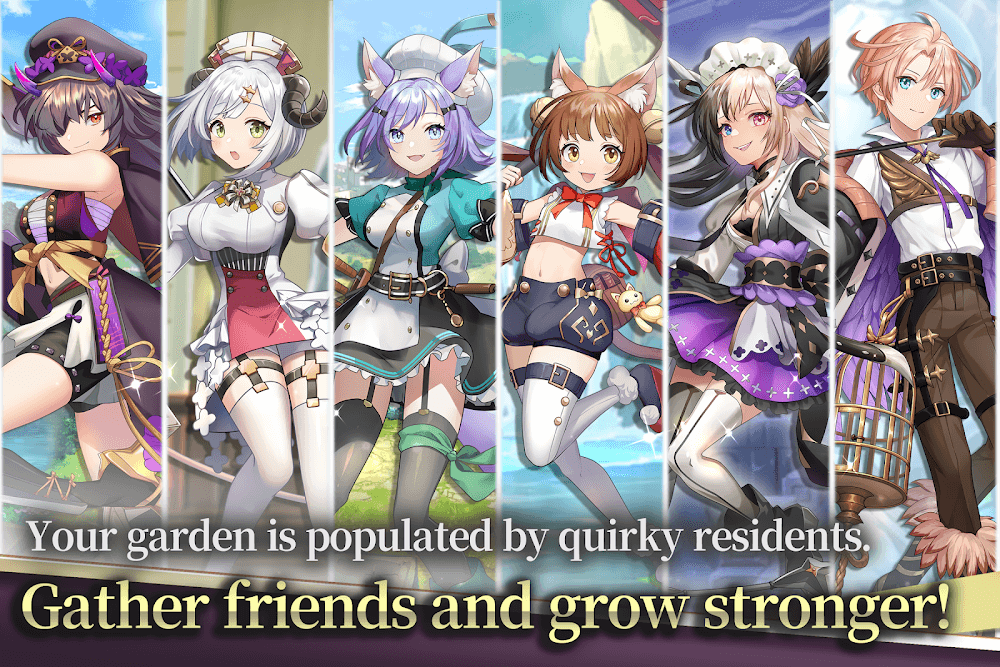 Материалы для тренировки производятся в битвах и на объектах. В части миниатюрного сада вы можете свободно строить объекты на поле, убирая деревья и камни. На каждом объекте можно производить боевые предметы, повышать уровень, эволюционировать и пробуждать персонажей. Персонажей в основном получают через гача, в группу вступают уникальные персонажи от кемономими до андроидов. Все персонажи растут до высшей редкости (изначально максимум — 4 звезды), поэтому я использовал в качестве силы 3-звёздочных и 2-звёздочных, которых легче пробуждать.
