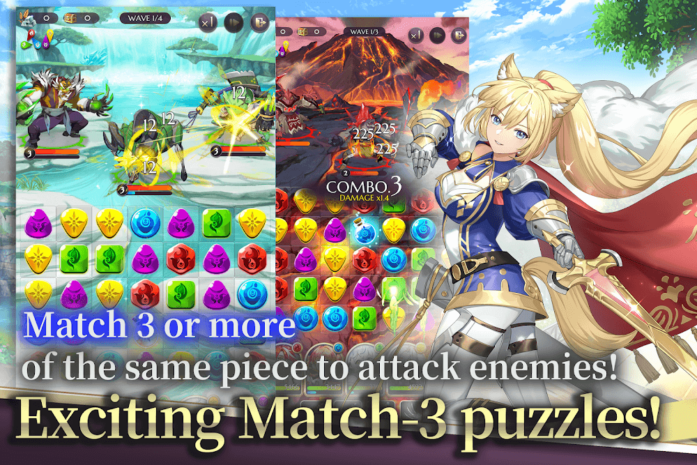 На сюжетных этапах встречаются полностью озвученные приключенческие части. Наслаждаясь историей, давайте испытаем себя в битве-головоломке «три в ряд». В битве за ход можно переместить только один блок на поле вверх, вниз, влево или вправо. Если выстроить 3 или более блока одного цвета по вертикали или горизонтали и убрать их, блоки нанесут удар врагу прямо сверху! Цель — пройти этап, умело решая головоломки, на которых расположены враги.