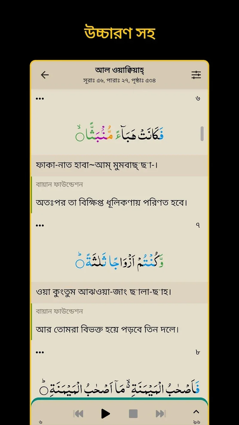 Bangla Quran -উচ্চারণসহ(কুরআн) предоставляет вам инструменты для поддержки чтения, понимания и запоминания Корана в соответствии с вашими пожеланиями. Интересно то, что приложение будет поддерживать перевод на множество различных языков, и пользователи могут свободно заучивать текст на каждом известном им языке. Будут добавлены уникальные коранические аяты, а приложение будет автоматически обновляться, чтобы эффективно экономить время пользователей.