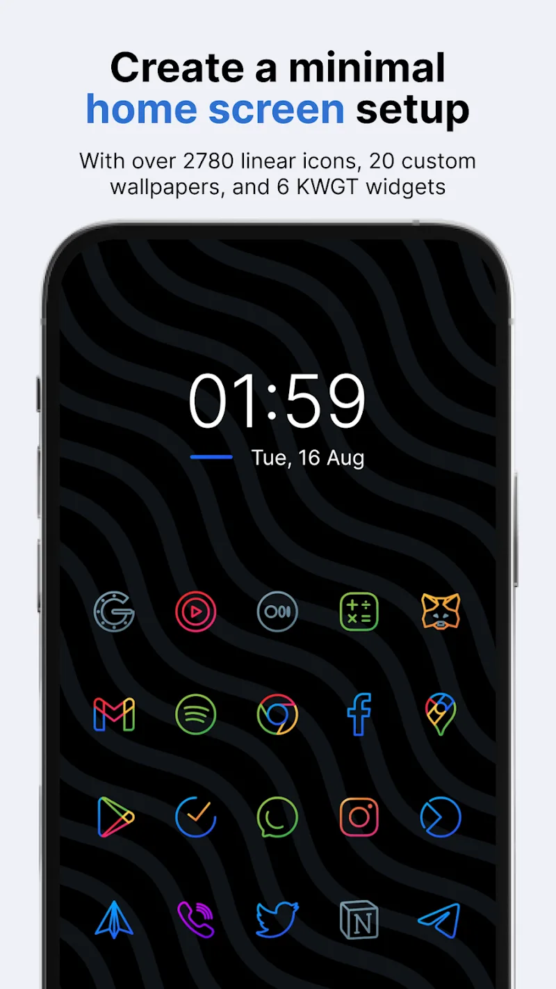 - Линейные разноцветные иконки: В этом приложении вы встретите линейные многоцветные иконки. Иконки с тщательно и продуманно подобранными цветами подарят вам невероятно привлекательные и красивые впечатления.