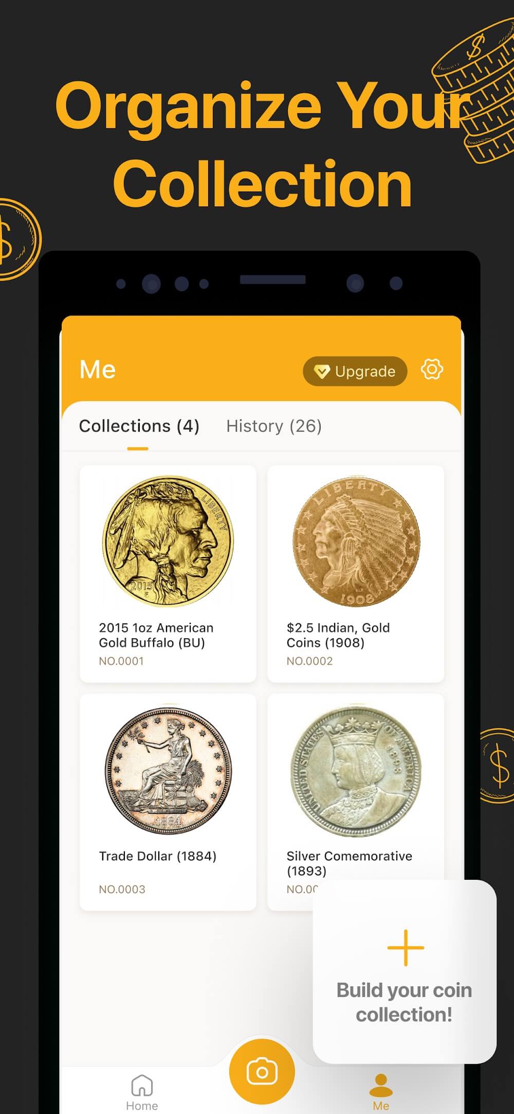 - Загружайте коллекции: Ваша коллекция монет начинается с того, что вы загружаете изображения монет, сортируете/классифицируете их по своему усмотрению и легко используете, когда это необходимо.