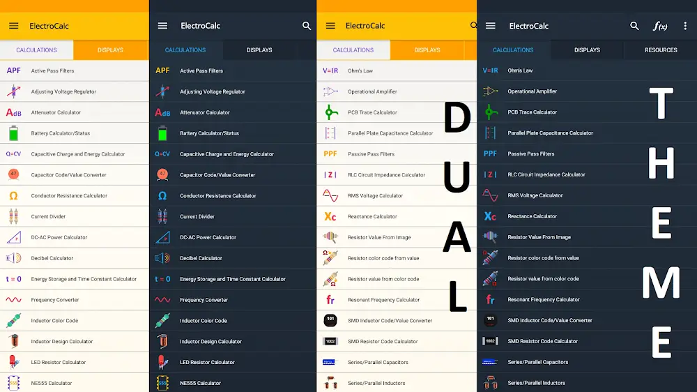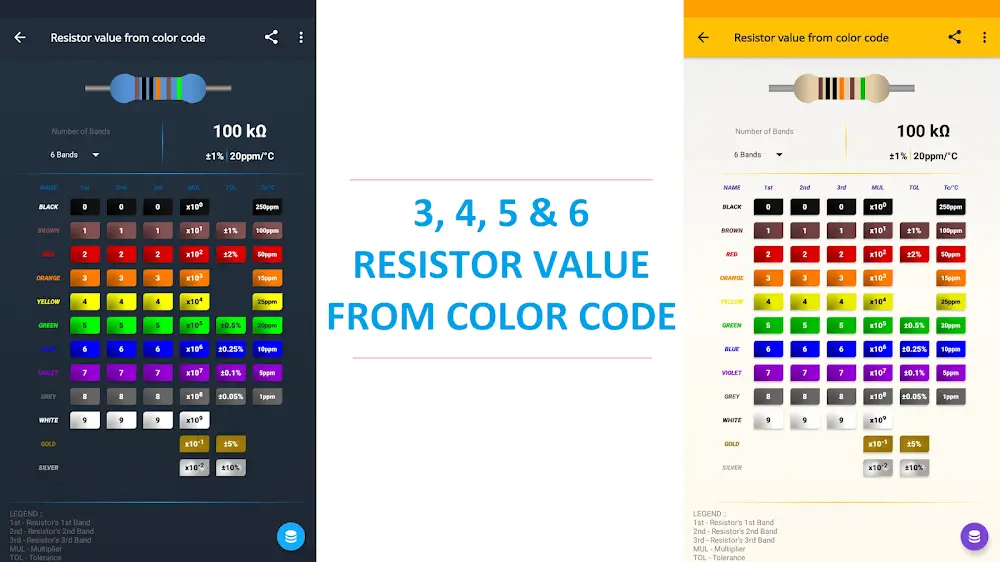 Расчёты могут быть сложной задачей для тех, кто работает и сталкивается с задачами, связанными с электрическими цепями. Но теперь вам не нужно по-настоящему беспокоиться о профессиональных вычислениях, поскольку ElectroCalc поддержит вас всеми функциями, связанными с расчётом электрических цепей. Приложение позволит своим пользователям рассчитывать множество различных величин, среди которых значение резистора по цветовому коду (3, 4, 5 и 6 полос) является типичным и важным видом расчёта.