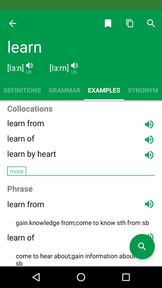 Но и это не всё: когда вы обращаетесь к этому приложению, вы получите необходимые и полезные функции, связанные с грамматикой. Вот почему, используя этот словарь, вы не только получаете общую информацию о лексике, но мы также предоставляем грамматику от базового до продвинутого уровня. В то же время появление примеров делает запоминание их использования проще, чем когда-либо.